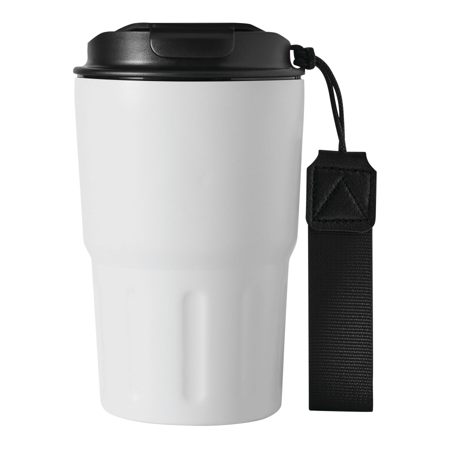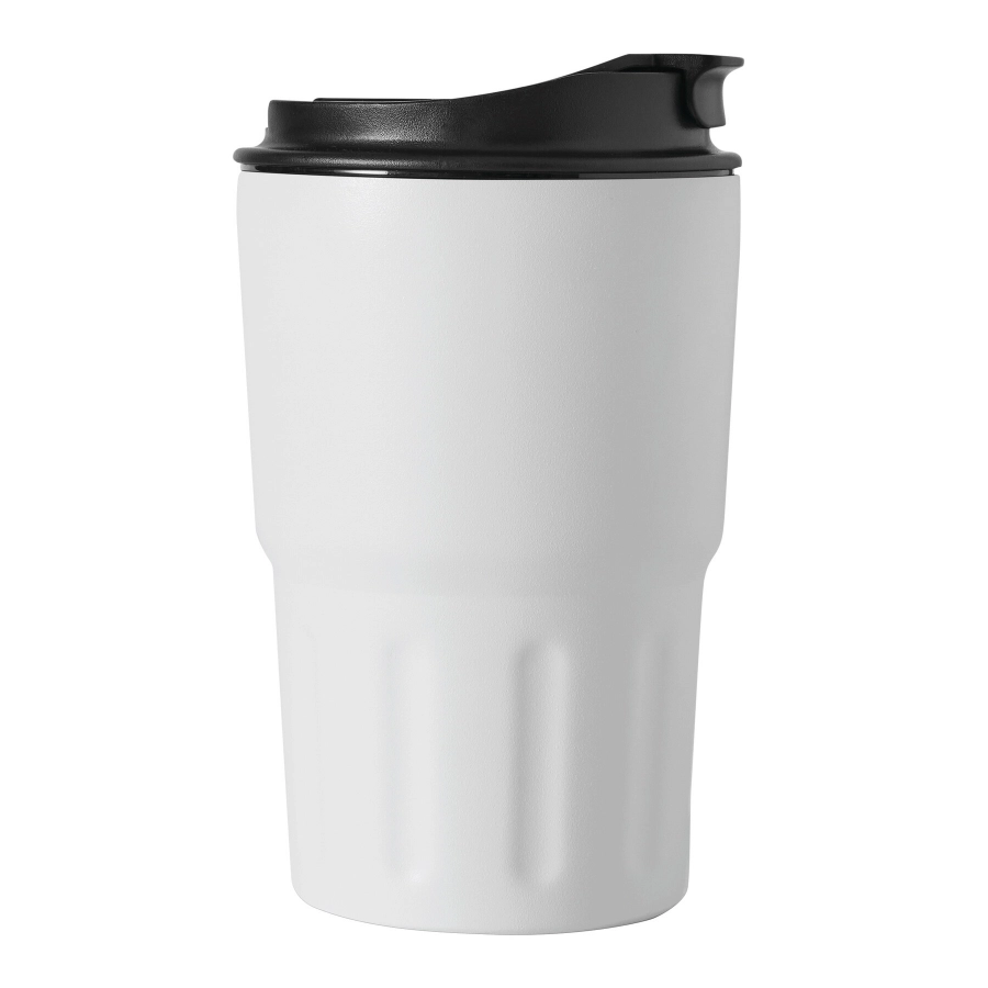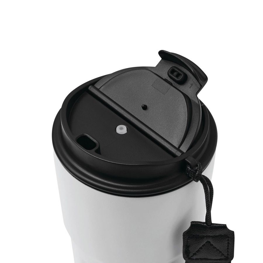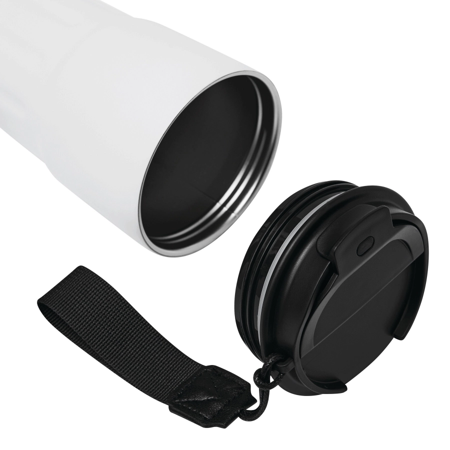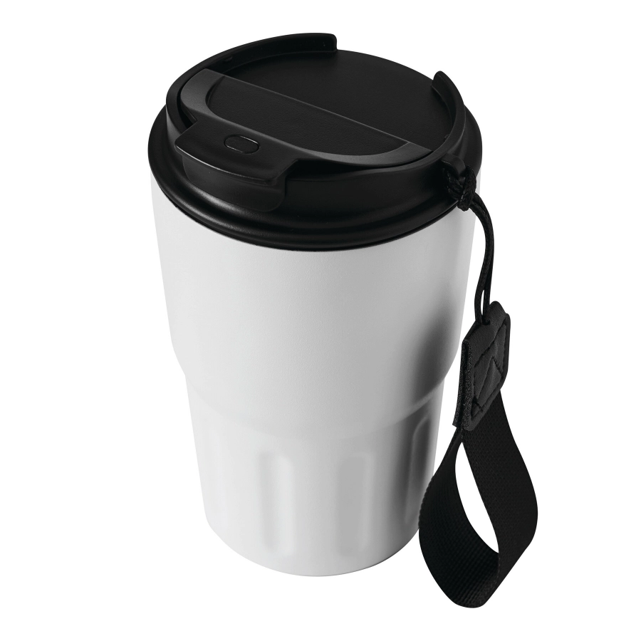 Kubek termiczny TRAVEL MUG, z podwójną izolacją: wewnątrz i na zewnątrz wykonany jest ze stali nierdzewnej. Ma matową powłokę proszkową, plastikową pokrywkę z bezpieczną zakrętką, silikonową uszczelką i otworem do picia. Pojemność kubka to ok. 400 ml. Posiada pasek na nadgarstek wykonanym z tworzywa sztucznego pochodzącego z recyklingu.