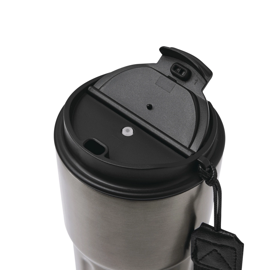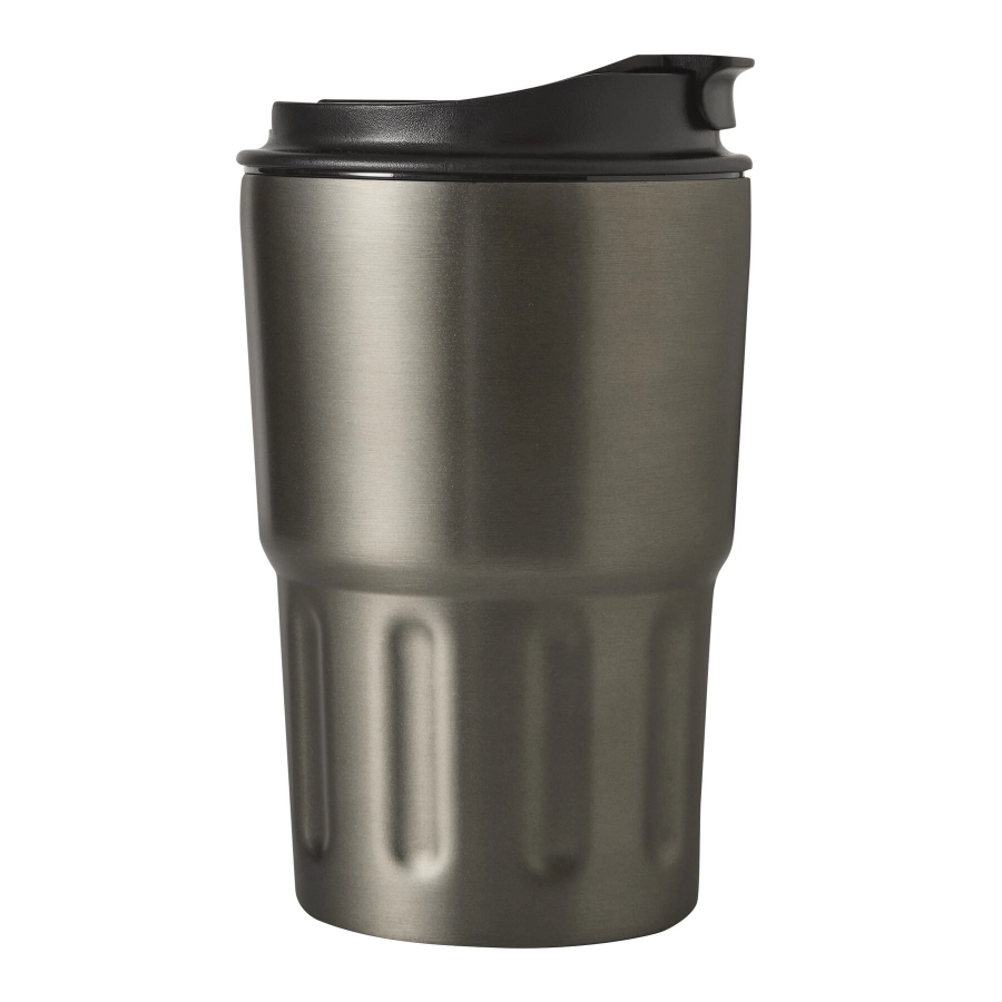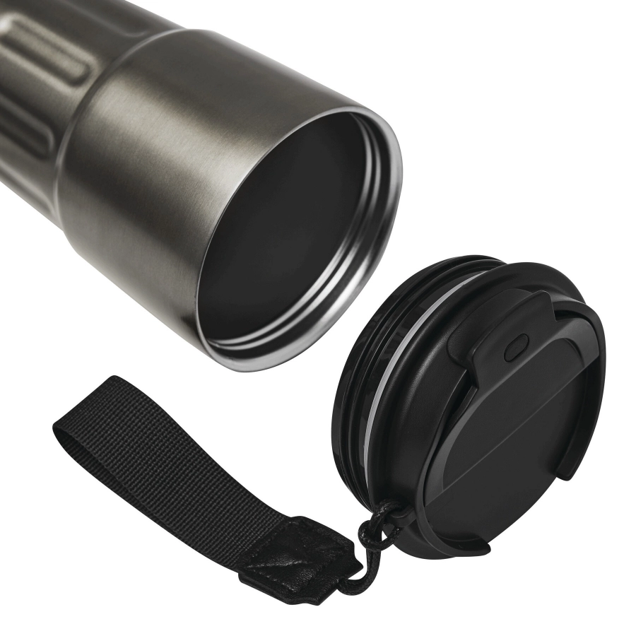 Kubek termiczny TRAVEL MUG, z podwójną izolacją: wewnątrz i na zewnątrz wykonany jest ze stali nierdzewnej. Ma matową powłokę proszkową, plastikową pokrywkę z bezpieczną zakrętką, silikonową uszczelką i otworem do picia. Pojemność kubka to ok. 400 ml. Posiada pasek na nadgarstek wykonanym z tworzywa sztucznego pochodzącego z recyklingu.