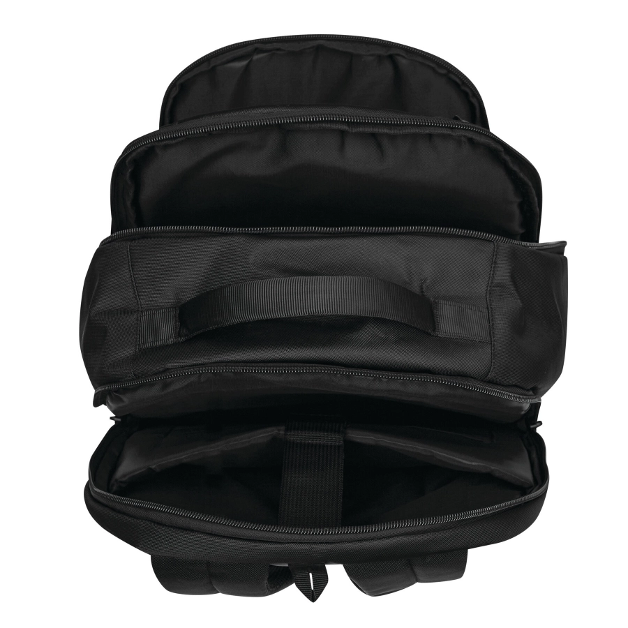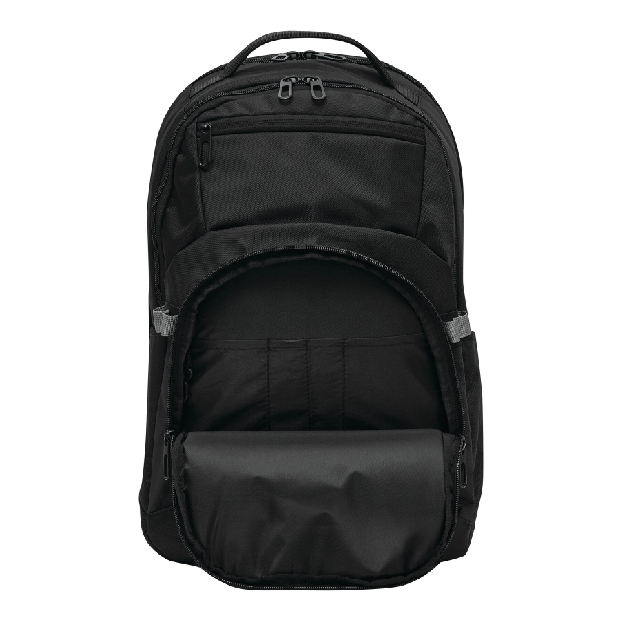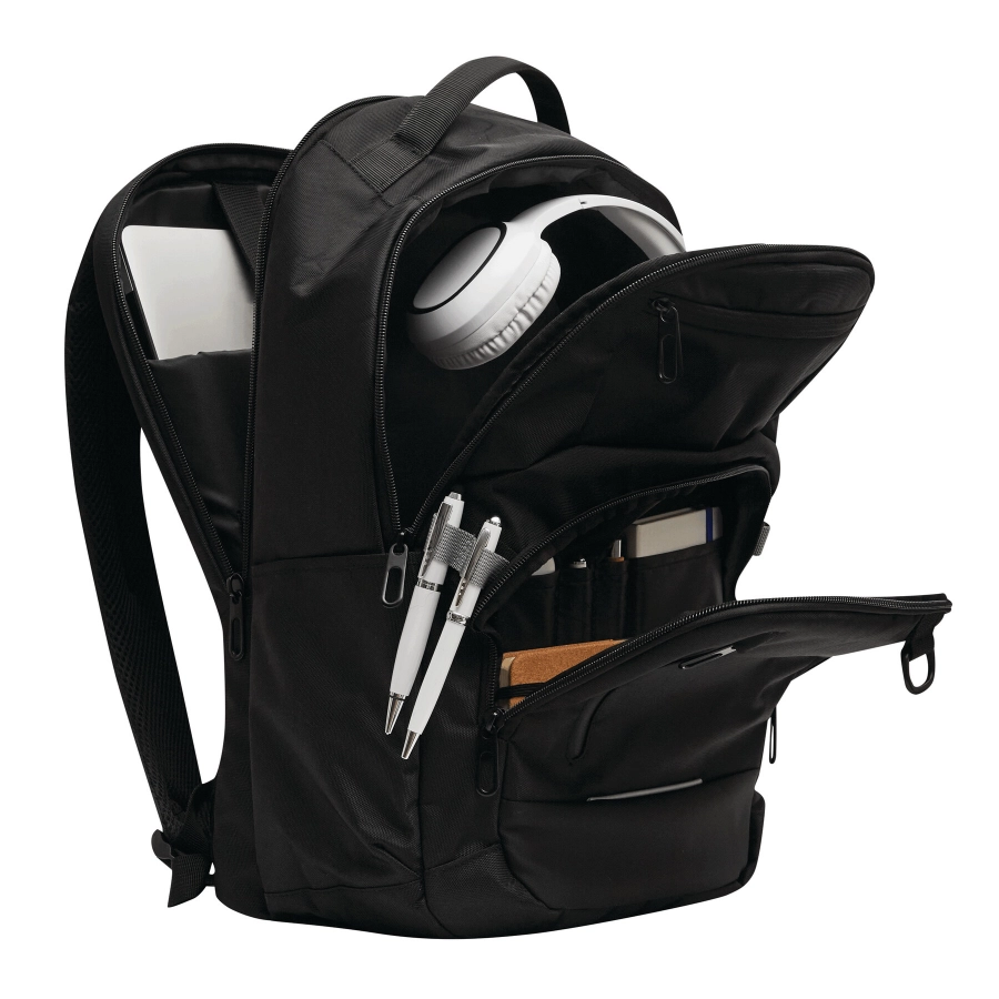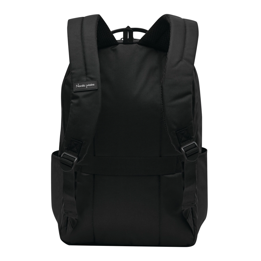 Plecak AARHUS z funcjonalnym paskiem do założenia na walizkę. Ma 3 przednie komory - 1 na suwak z organizerem, 1 pionową na suwak oraz 1 poziomą na suwak z aksamitną podszewką (idealną np. na smartfona). Posiada też odblaskowe paski, 2 kieszenie boczne, 2 główne przegrody na suwak - jedną z miękką przegrodą wewnętrzną na laptopa lub tablet i dodatkową kieszenią. Posiada wygodny uchwyt do przenoszenia oraz mniejszy do zawieszenia, a także pierścień i uchwyty na długopisy. Ma miękkie szelki o ergonomicznym kształcie i wyściełane plecy. Produkt marki Nordic Plains.
