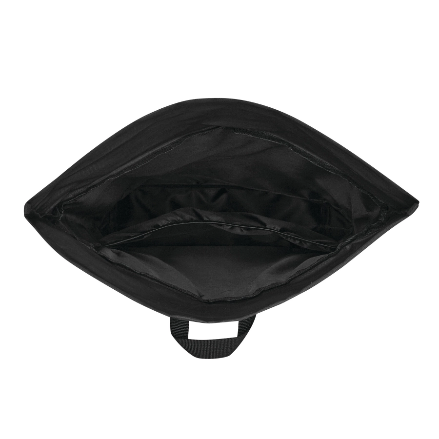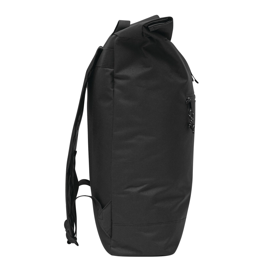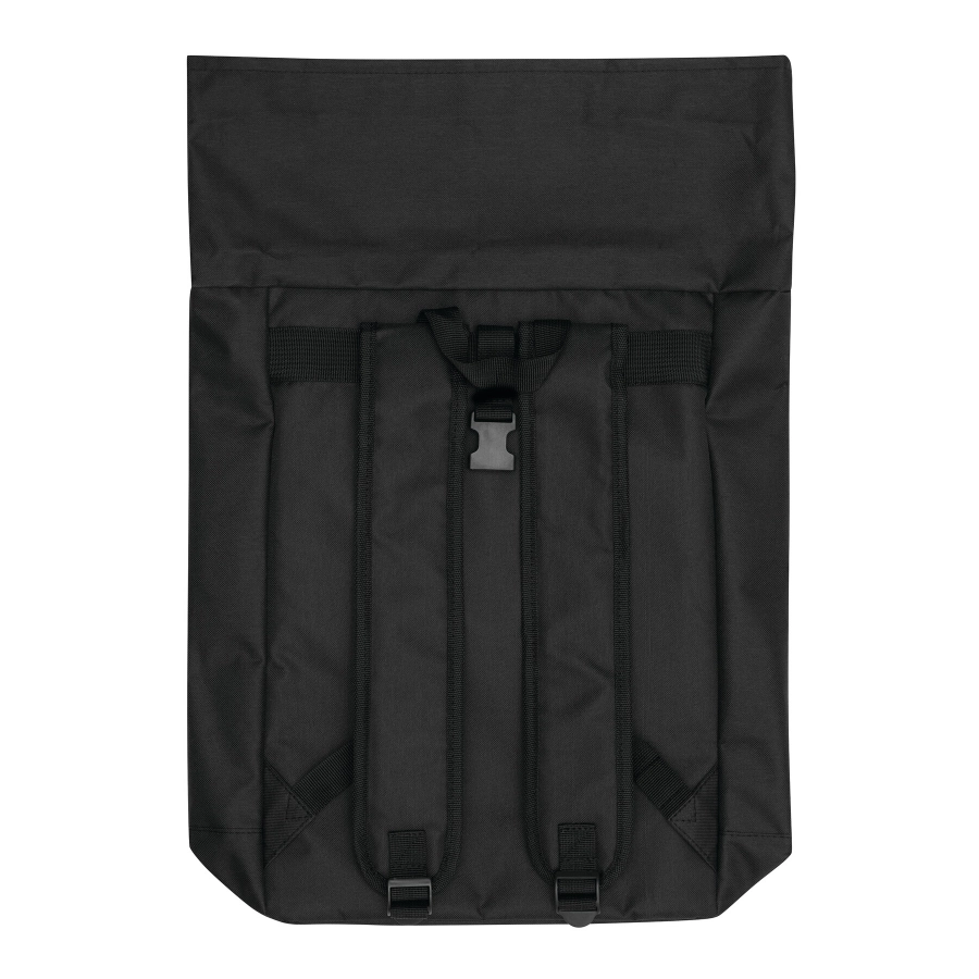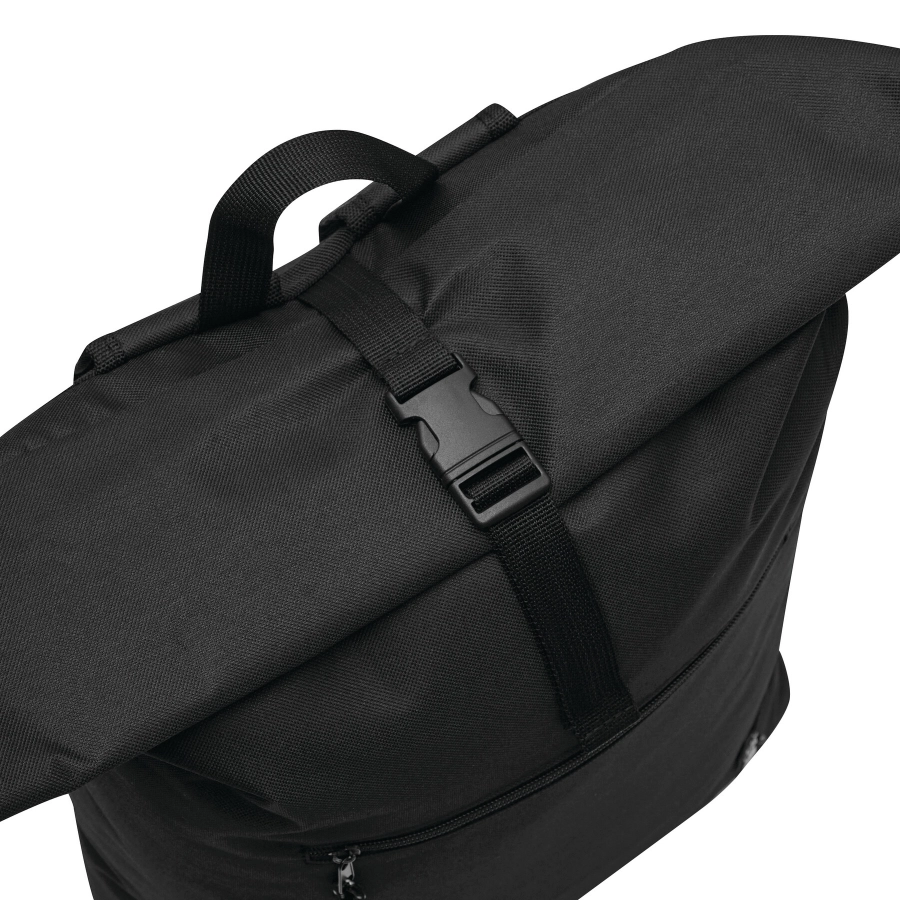 Plecak ROLL-TOP wykonany jest z tworzywa sztucznego pochodzącego z recyklingu (RPET). Posiada poziomą komorę przednią zapinaną na zamek błyskawiczny oraz dużą komorę główną z wyściełaną przegrodą wewnętrzną na laptopa lub tablet. Plecak można zwiniąć i zamknąć na zatrzask. Ma wygodny pasek do przenoszenia oraz wyściełaną podstawę, szelki i plecy.