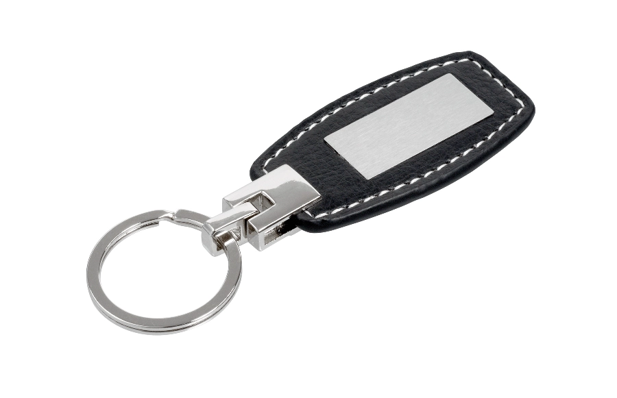 Brelok LABEL ze skóry ekologicznej z kontrastującymi szwami i cynkową płytką na grawer, brelok wykonany z metalu.