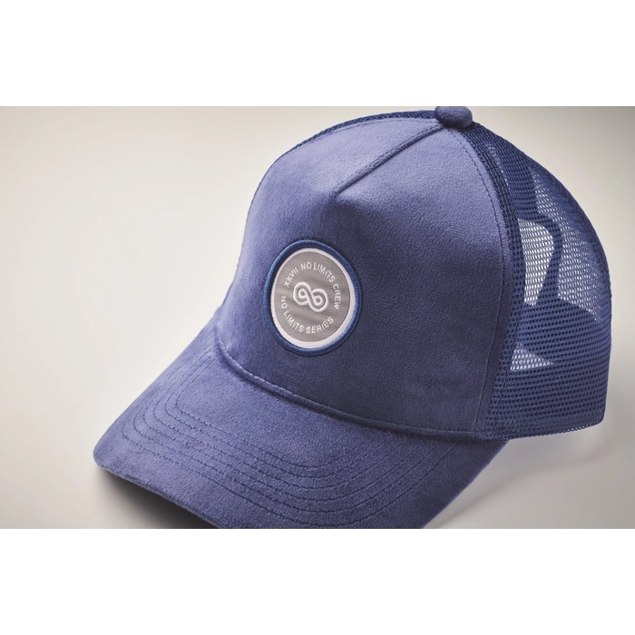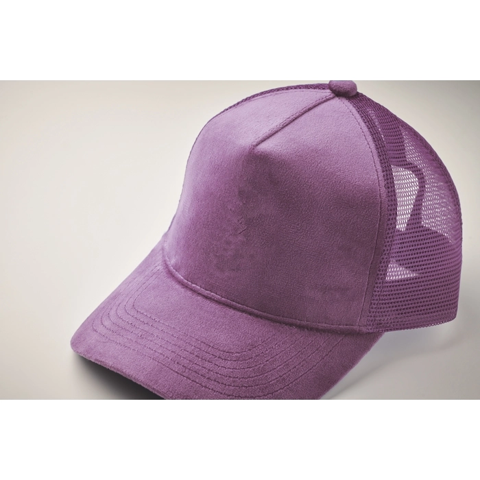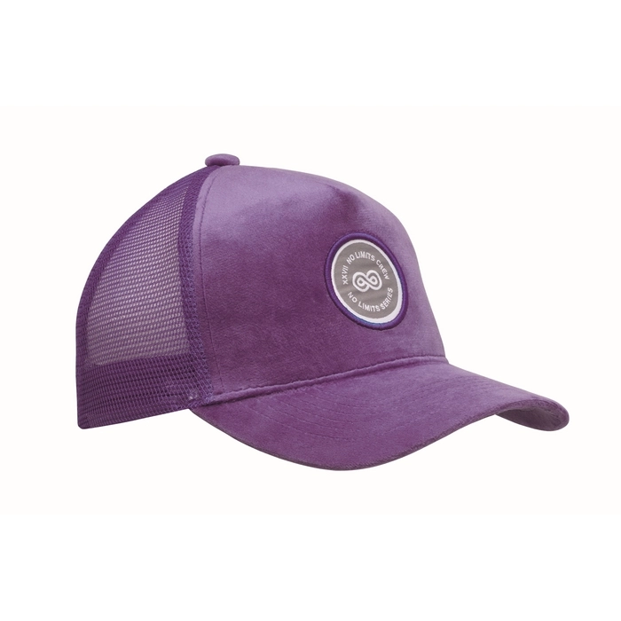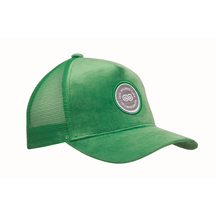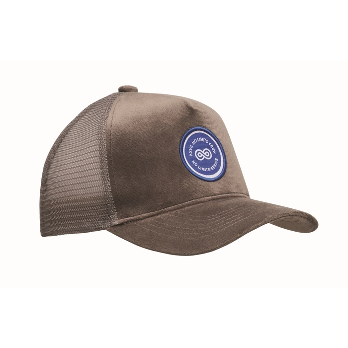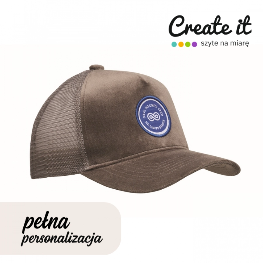 PRODUKCJA INDYWIDUALNA - Aksamitna czapka typu trucker, 5-panelowa, o wysokim profilu.
