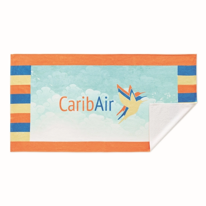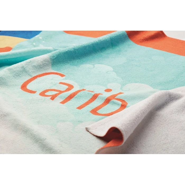 Ręcznik plażowy full colour to wyjątkowy produkt, który można całkowicie dostosować do indywidualnych potrzeb klienta. Dzięki połączeniu poliestru (40%) i bawełny (60%), oferuje nie tylko estetyczny wygląd, ale także doskonałą funkcjonalność. Przednia, welurowa strona wykonana z poliestru jest zadrukowana w pełnym kolorze, co zapewnia intensywność i wyrazistość nadruku, jednocześnie oferując miękką teksturę. Tył ręcznika wykonany z białej bawełny frotte gwarantuje maksymalną chłonność, co jest kluczowe podczas użytkowania na plaży.