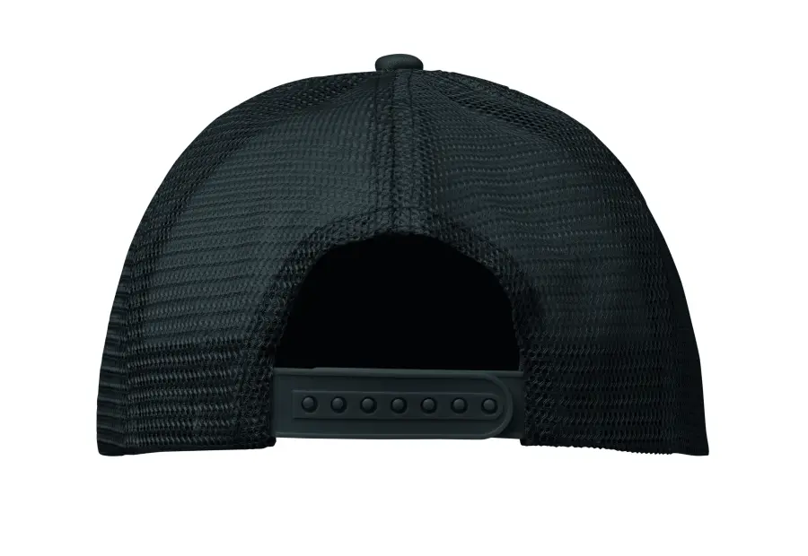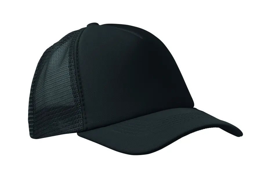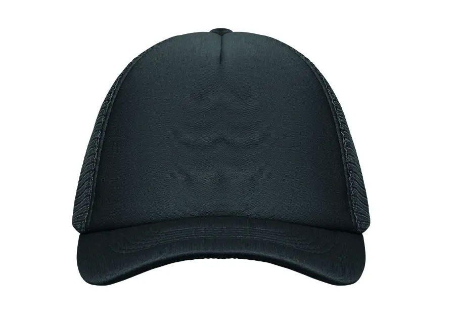 5-panelowa czapka typu trucker z regulowanym zapięciem na plastikowy zatrzask. Biały przedni panel oraz kolorowy daszek wykonany z poliestru i pianki (140-150 gr/m2 ). Pozostałe panele z kolorowej siatki. Rozmiar 7 1/4.