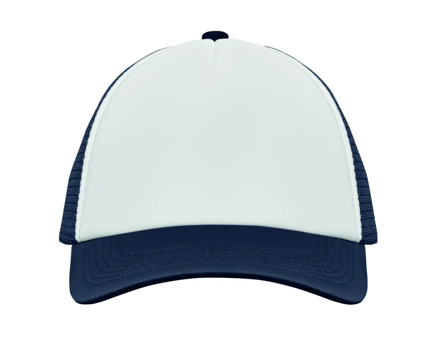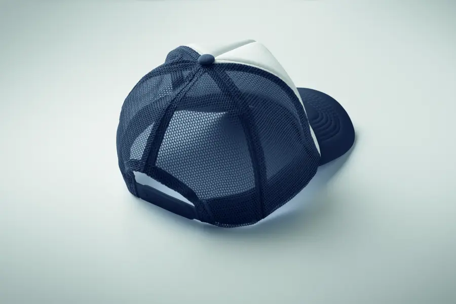 5-panelowa czapka typu trucker z regulowanym zapięciem na plastikowy zatrzask. Biały przedni panel oraz kolorowy daszek wykonany z poliestru i pianki (140-150 gr/m2 ). Pozostałe panele z kolorowej siatki. Rozmiar 7 1/4.