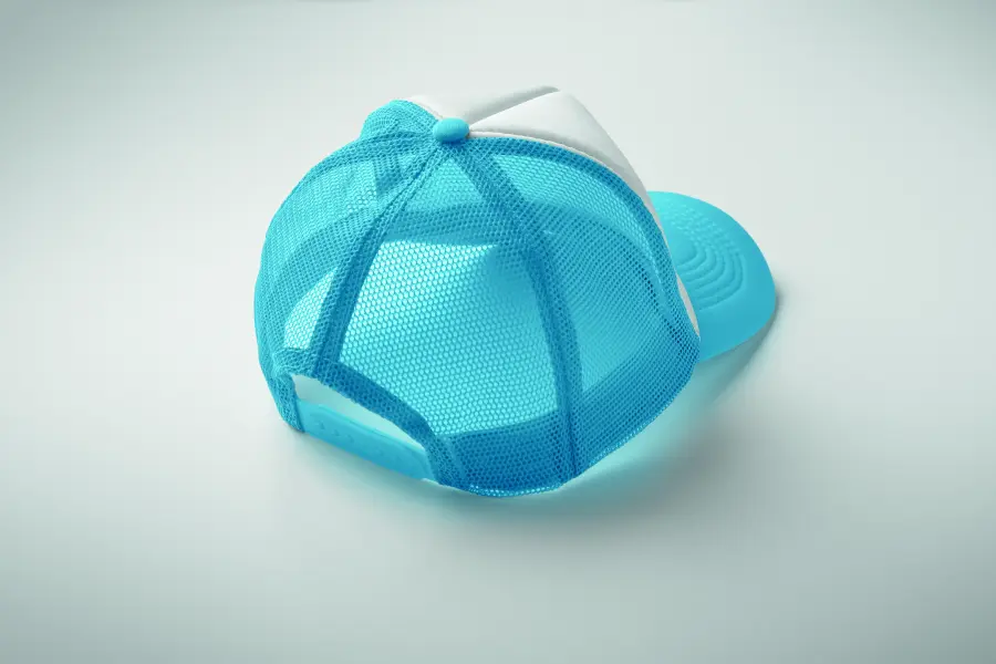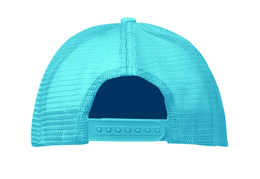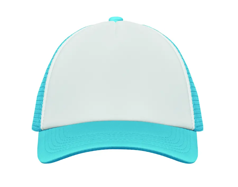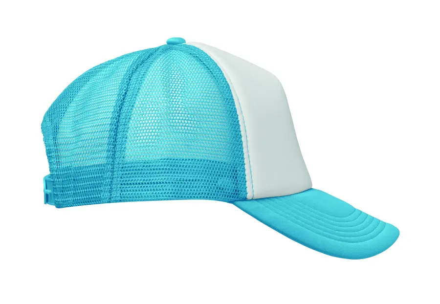 5-panelowa czapka typu trucker z regulowanym zapięciem na plastikowy zatrzask. Biały przedni panel oraz kolorowy daszek wykonany z poliestru i pianki (140-150 gr/m2 ). Pozostałe panele z kolorowej siatki. Rozmiar 7 1/4.