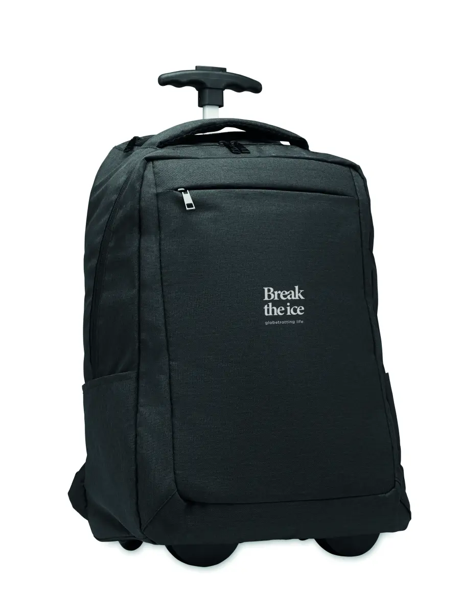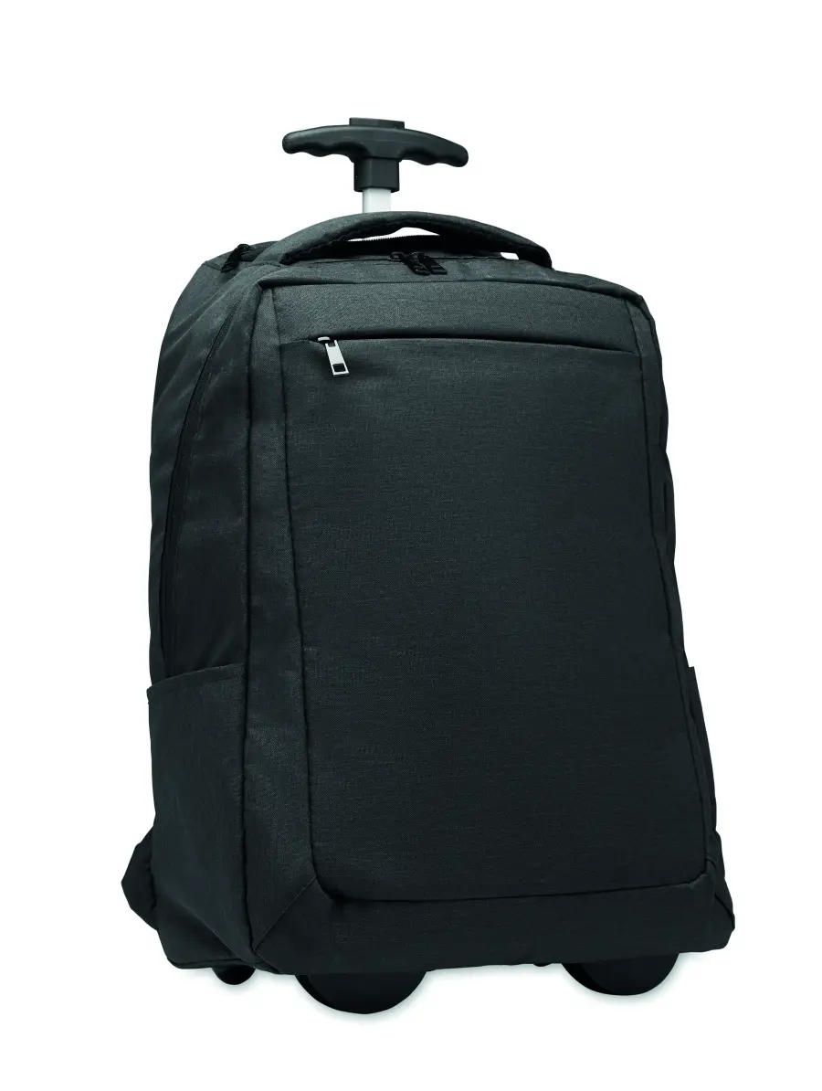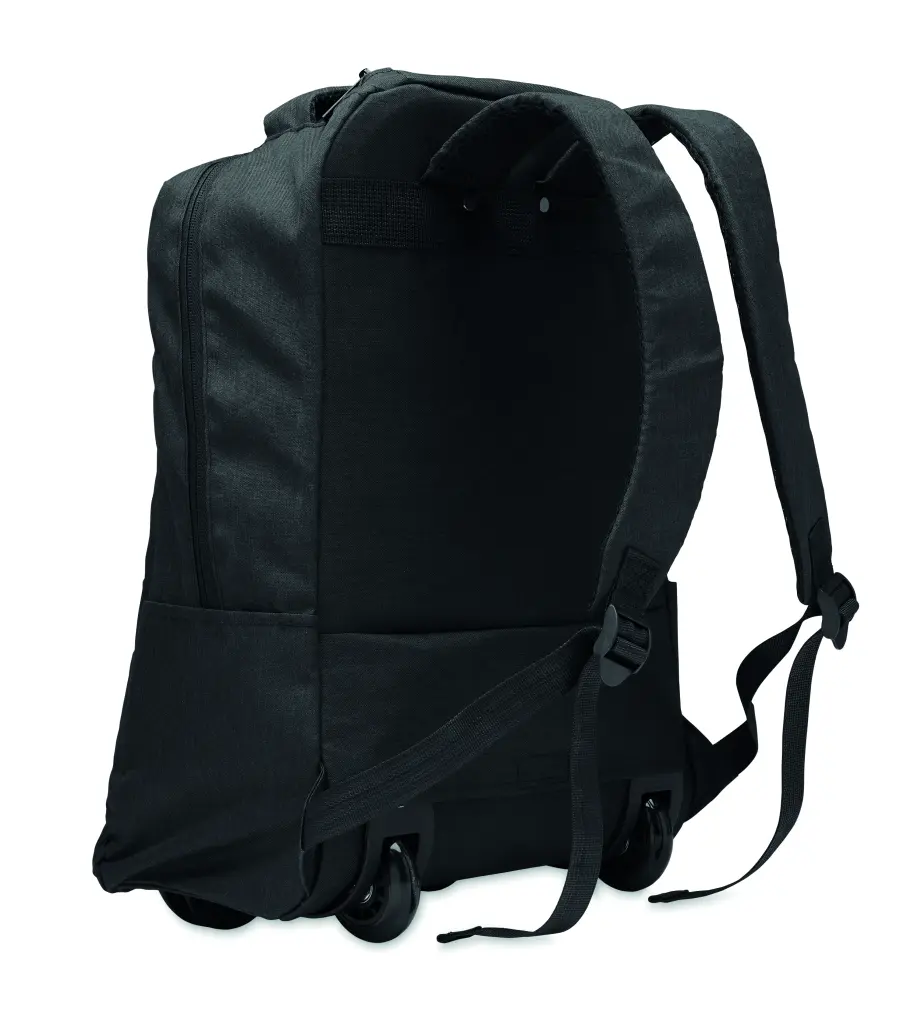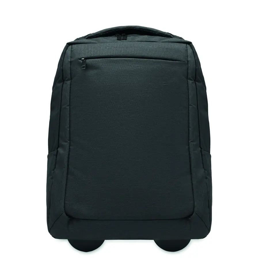 Plecak na laptopa na kółkach z poliestru 600D RPET. Zawiera jedną wewnętrzną przegrodę na laptopa 15 cali. Przednia kieszeń zapinana na zamek. Dwie boczne kieszenie wsuwane. Trzy wewnętrzne kieszenie wsuwane. Wyściełane plecy i szelki. 2 kółka i podwójna rama.