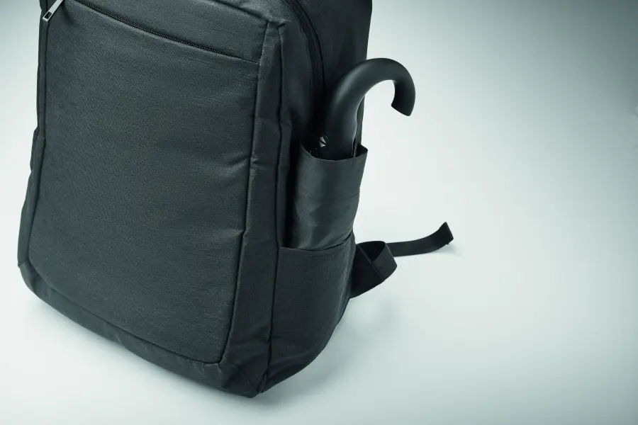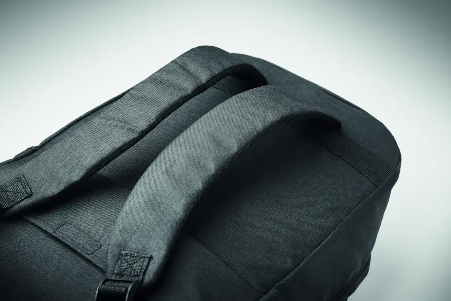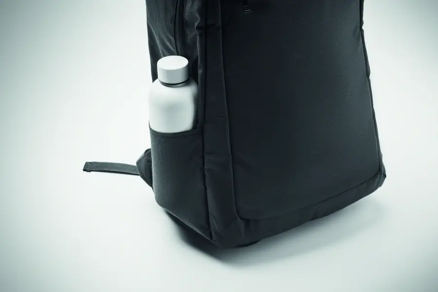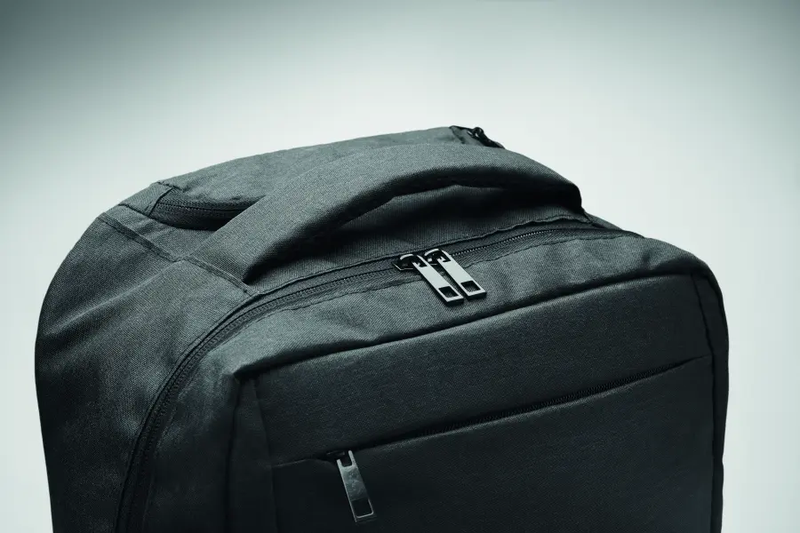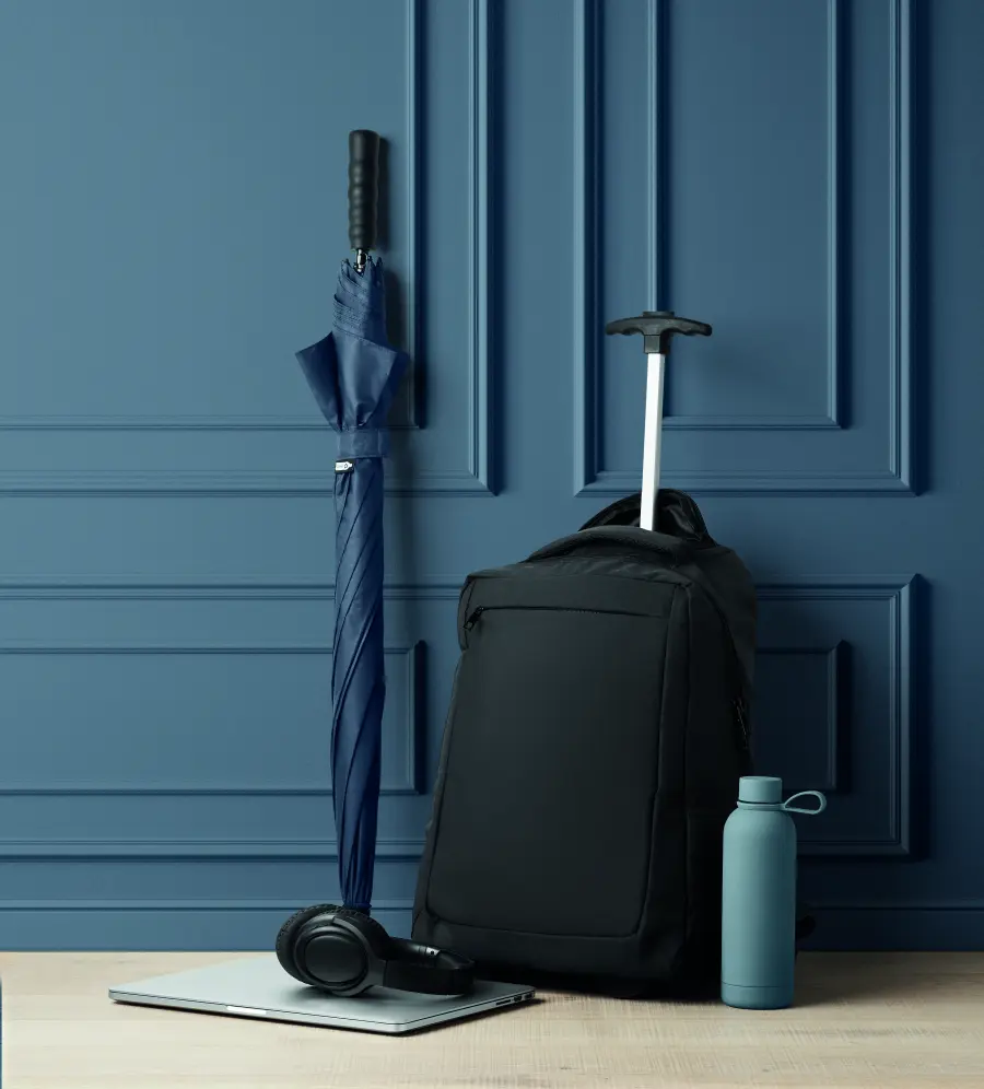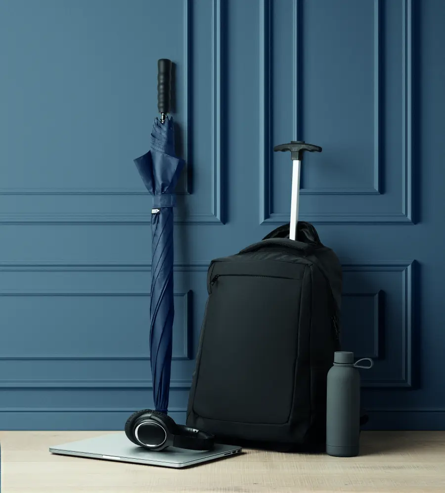 Plecak na laptopa na kółkach z poliestru 600D RPET. Zawiera jedną wewnętrzną przegrodę na laptopa 15 cali. Przednia kieszeń zapinana na zamek. Dwie boczne kieszenie wsuwane. Trzy wewnętrzne kieszenie wsuwane. Wyściełane plecy i szelki. 2 kółka i podwójna rama.