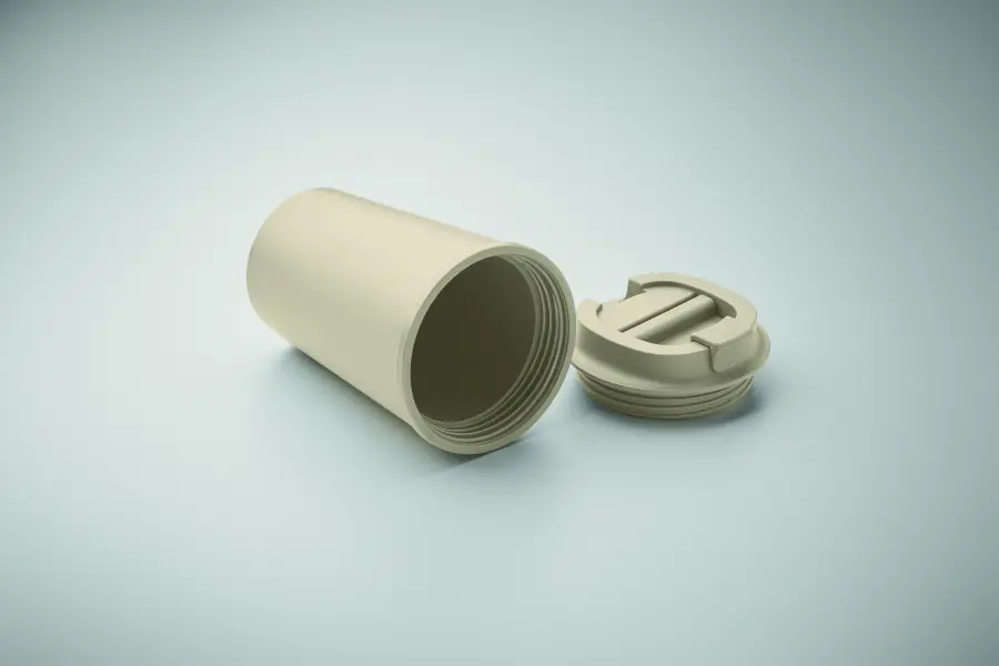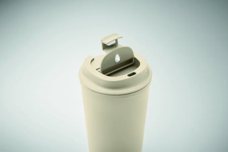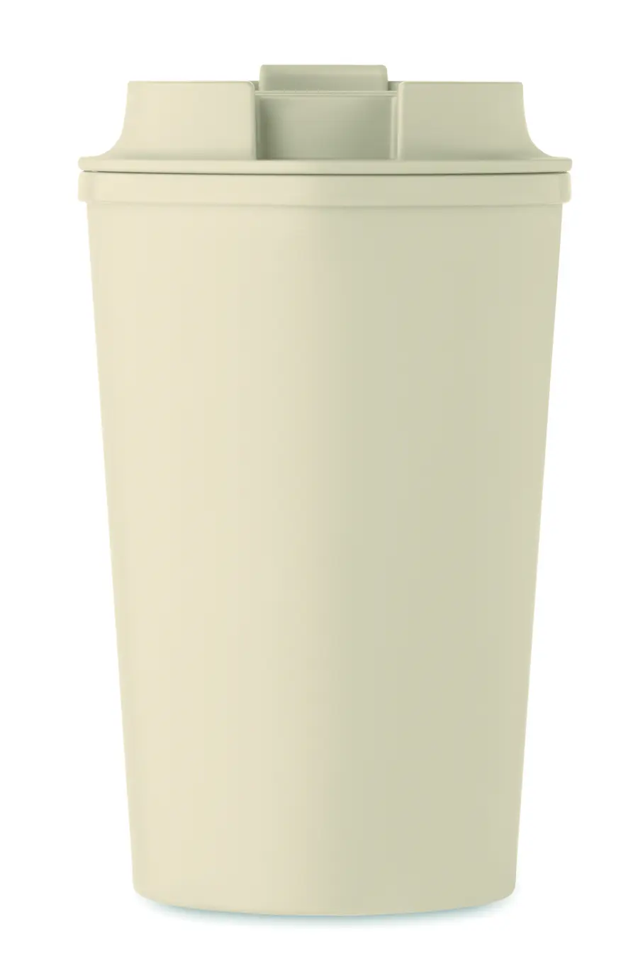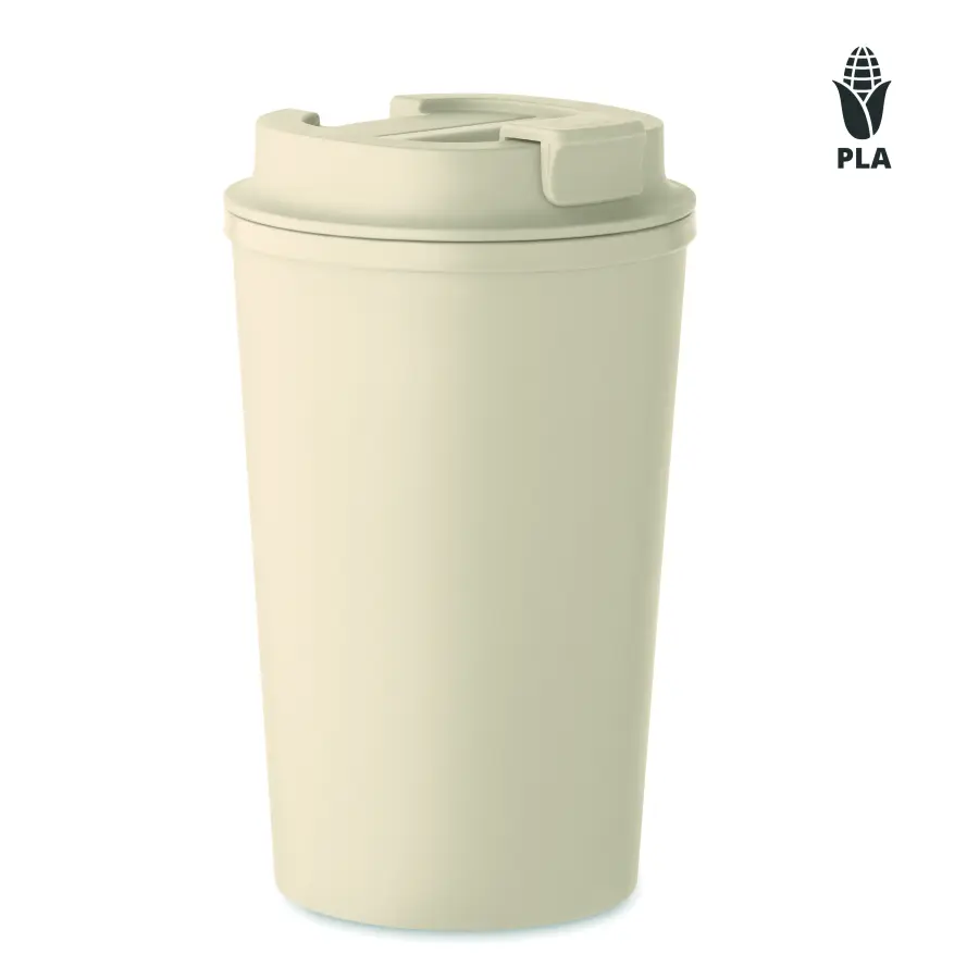Kubek z podwójnymi ściankami z kukurydzy PLA z pokrywką do picia z PP z wewnętrznym TPR. Pojemność: 350 ml.