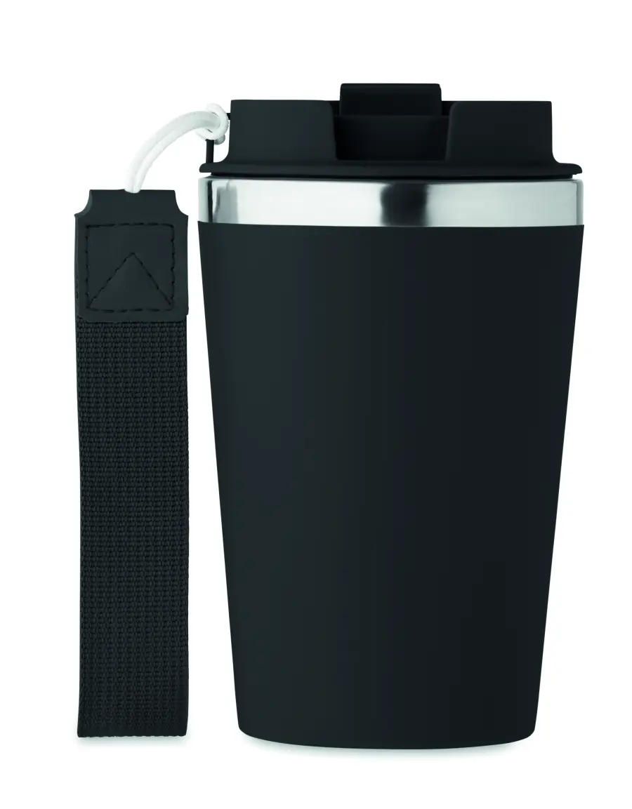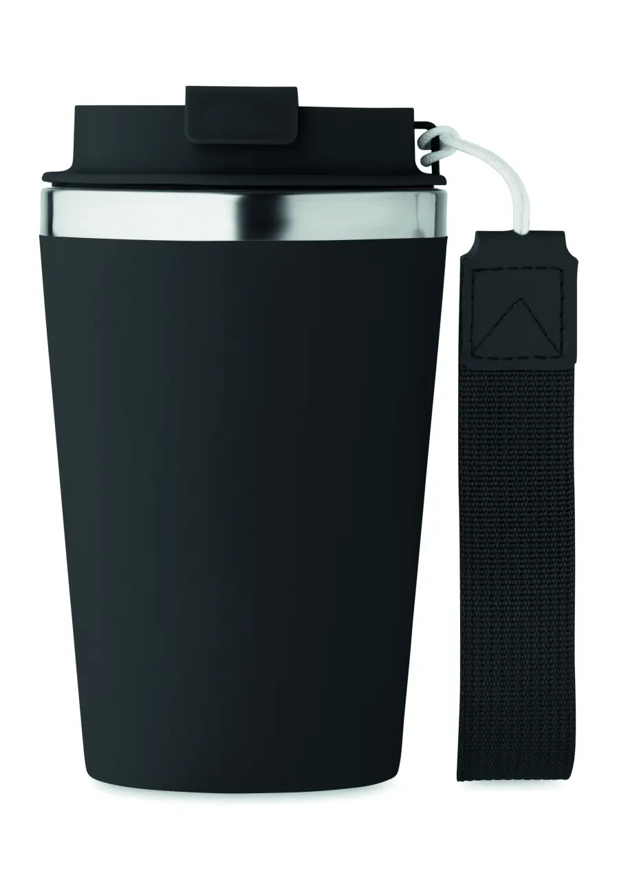 Kubek z podwójnymi ściankami z recyklingowanej stali nierdzewnej (90% recyklingowanej stali nierdzewnej i 10% stali nierdzewnej) z zewnętrzną warstwą z PP i paskiem na nadgarstek z RPET. Pojemność: 350 ml.