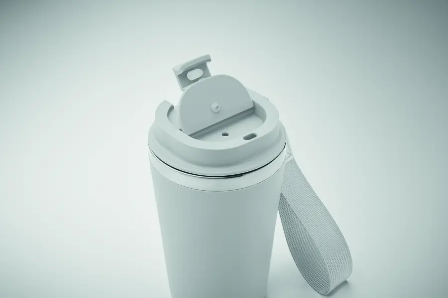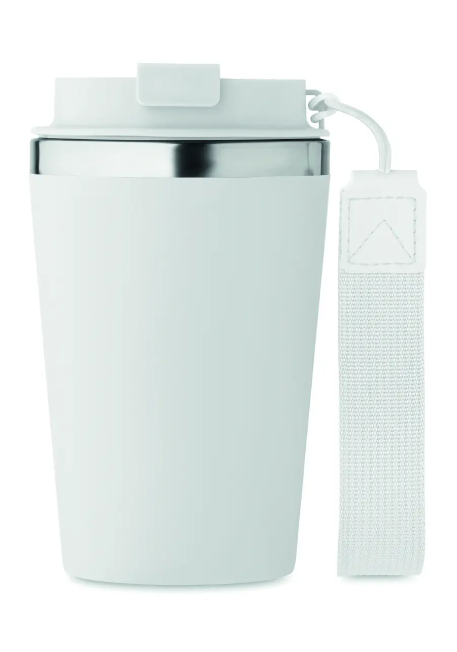 Kubek z podwójnymi ściankami z recyklingowanej stali nierdzewnej (90% recyklingowanej stali nierdzewnej i 10% stali nierdzewnej) z zewnętrzną warstwą z PP i paskiem na nadgarstek z RPET. Pojemność: 350 ml.