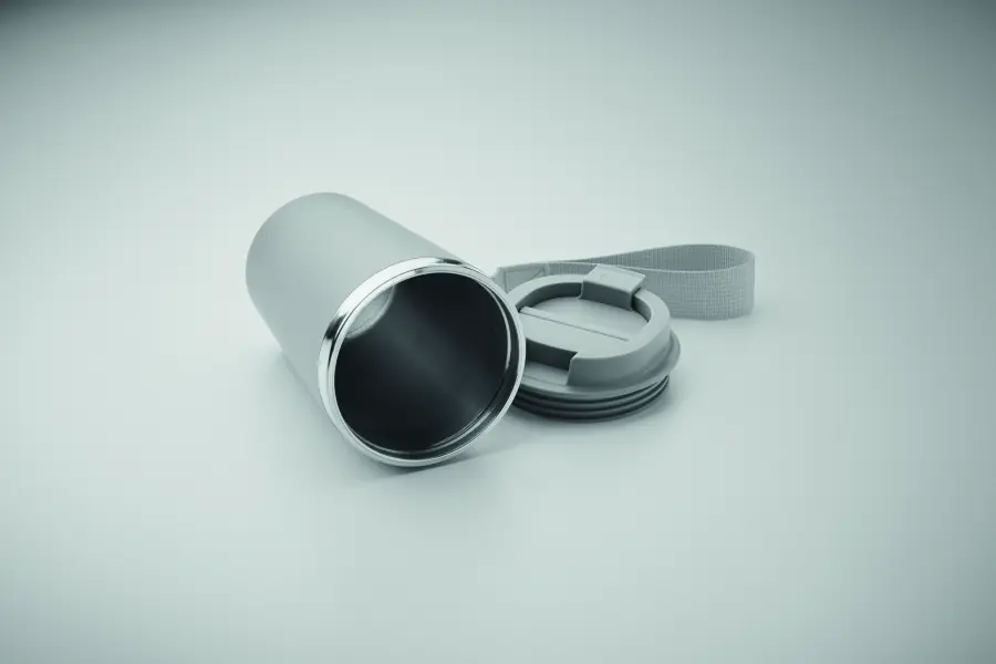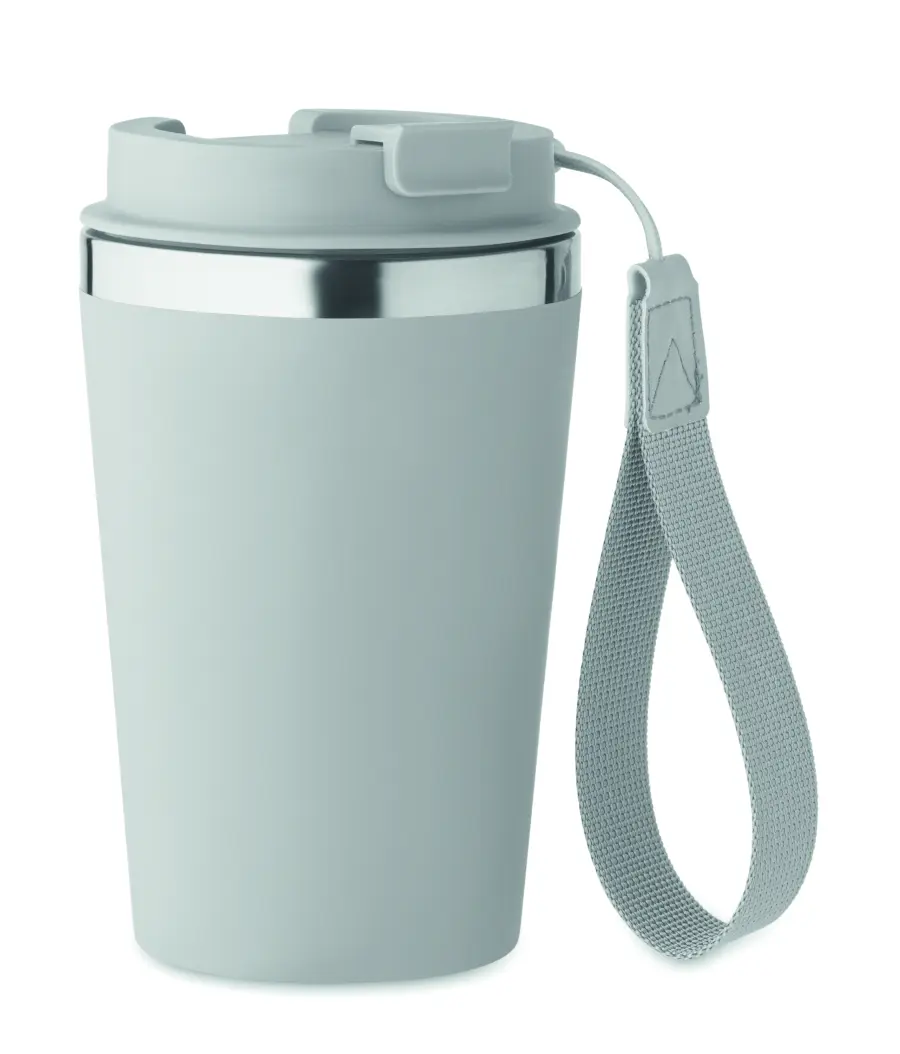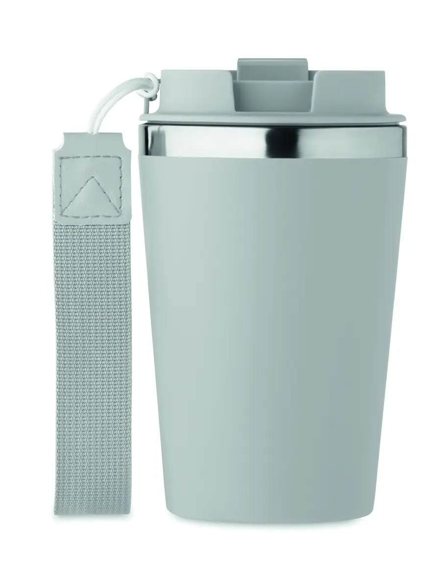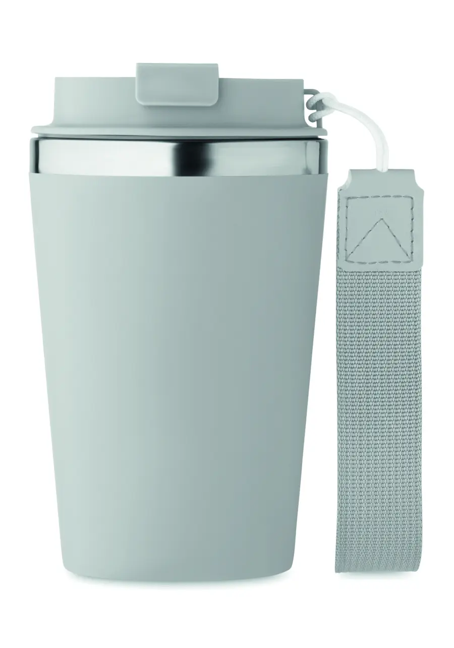 Kubek z podwójnymi ściankami z recyklingowanej stali nierdzewnej (90% recyklingowanej stali nierdzewnej i 10% stali nierdzewnej) z zewnętrzną warstwą z PP i paskiem na nadgarstek z RPET. Pojemność: 350 ml.