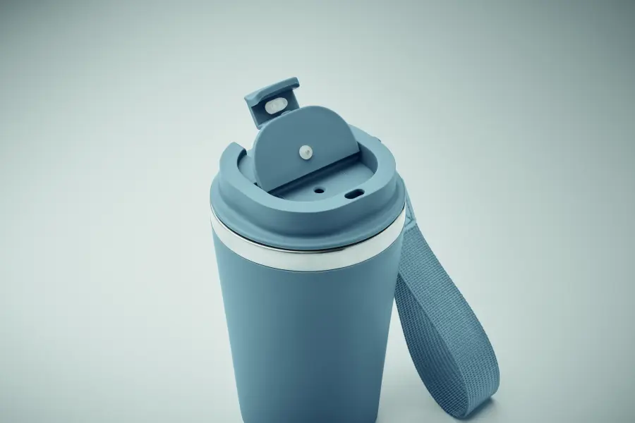 Kubek z podwójnymi ściankami z recyklingowanej stali nierdzewnej (90% recyklingowanej stali nierdzewnej i 10% stali nierdzewnej) z zewnętrzną warstwą z PP i paskiem na nadgarstek z RPET. Pojemność: 350 ml.