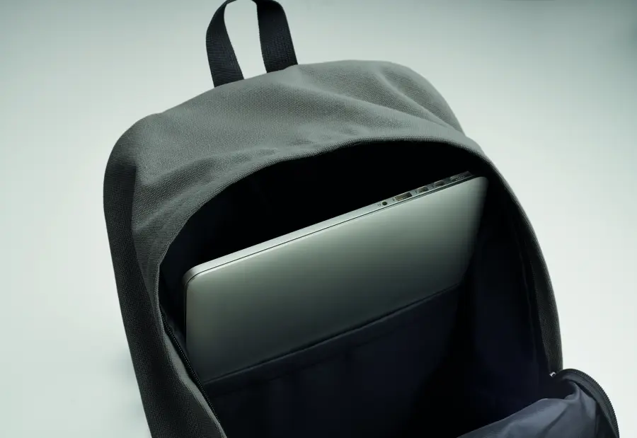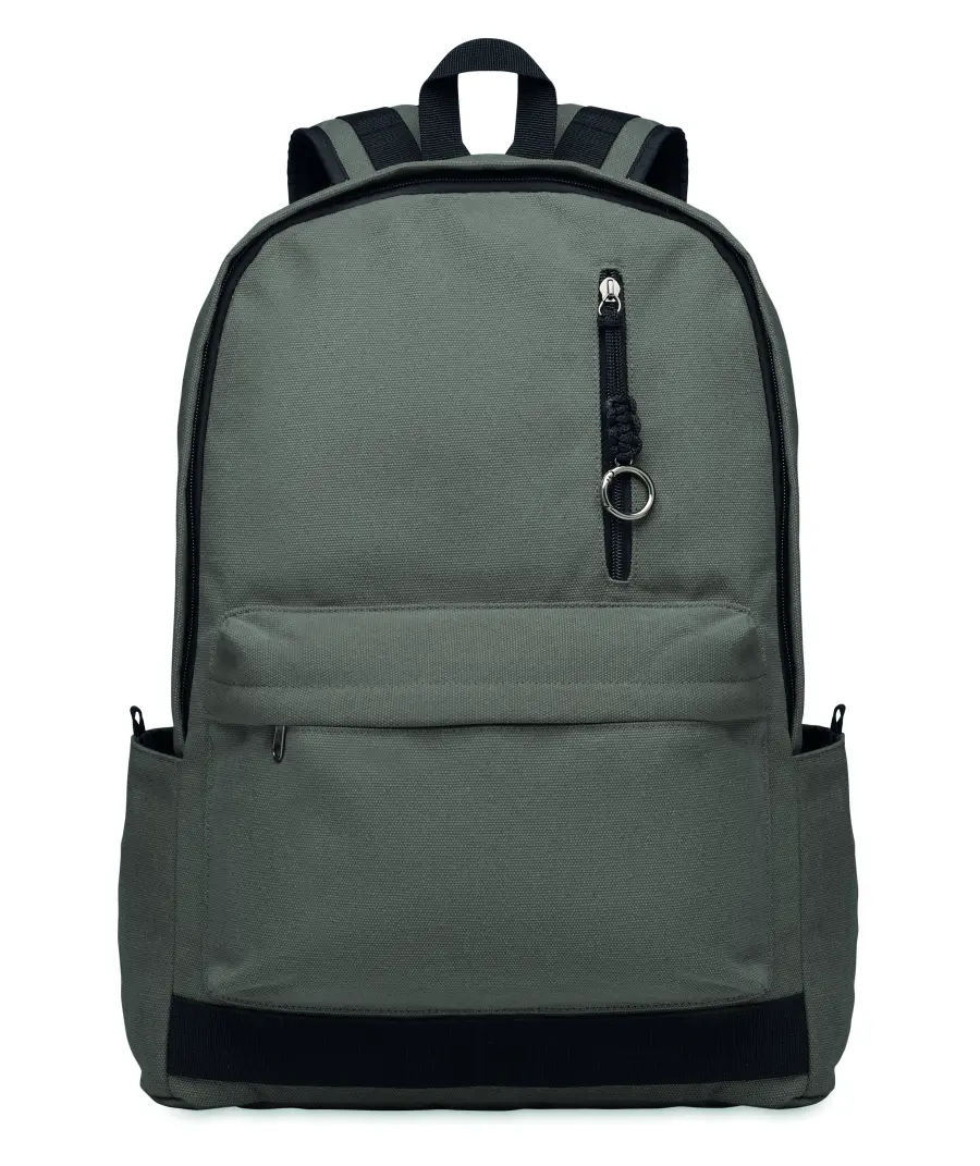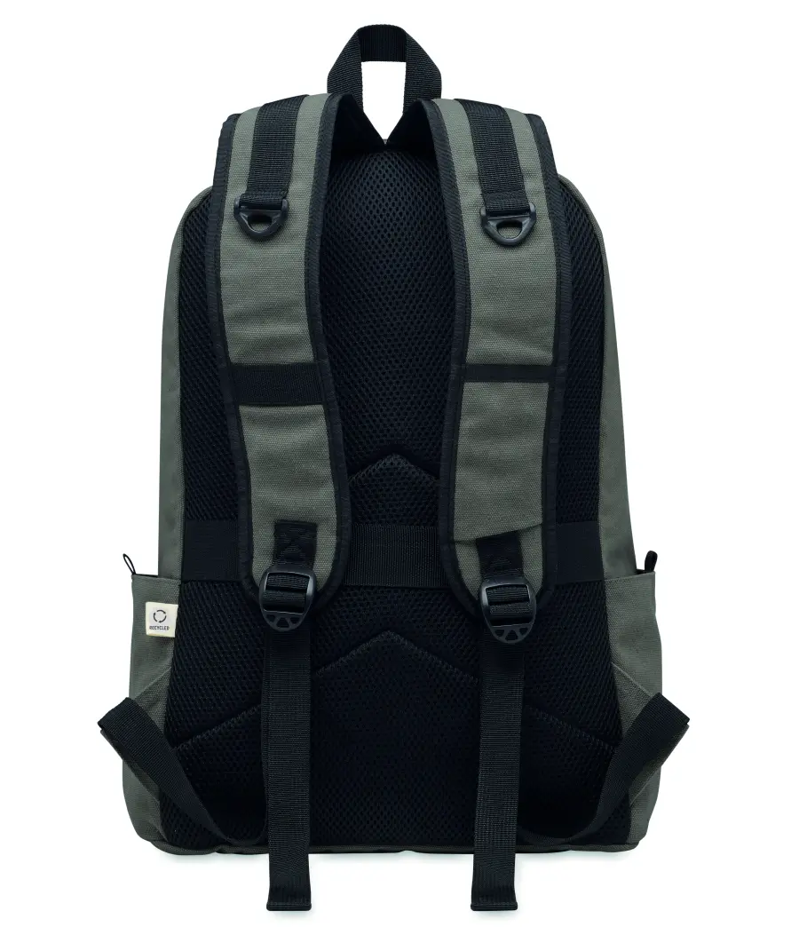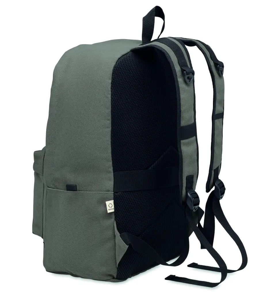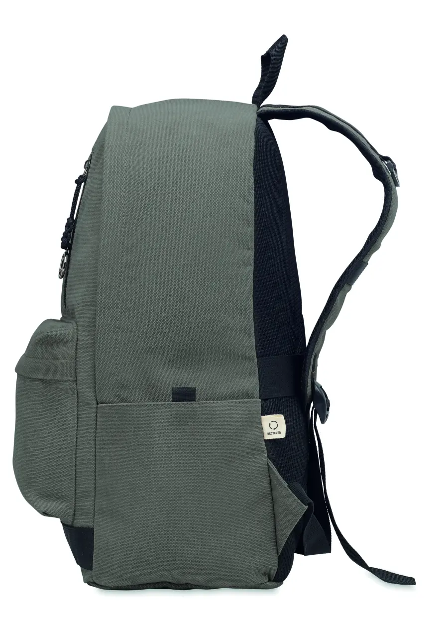 Plecak na laptopa 15 cali z bawełny z prekonsumenckiego recyklingu. Duża przednia kieszeń zapinana na zamek z wewnętrzną przegrodą na laptopa. Mała przednia kieszeń na suwak. Dwie boczne kieszenie wsuwane. Wyściełane plecy i szelki, tylny panel i spód. 450 gr/m².