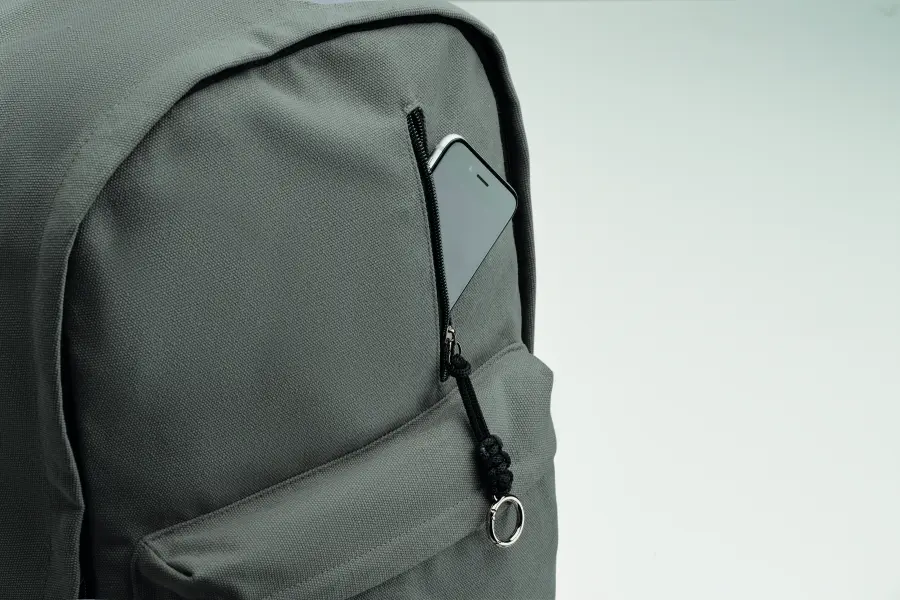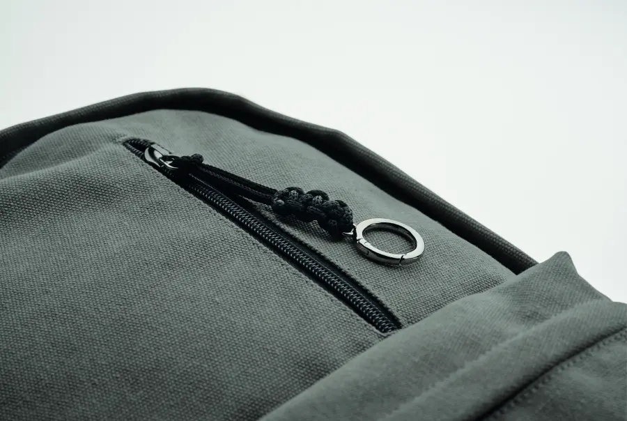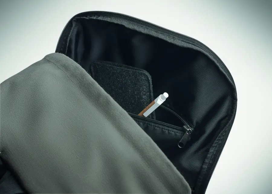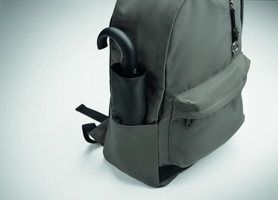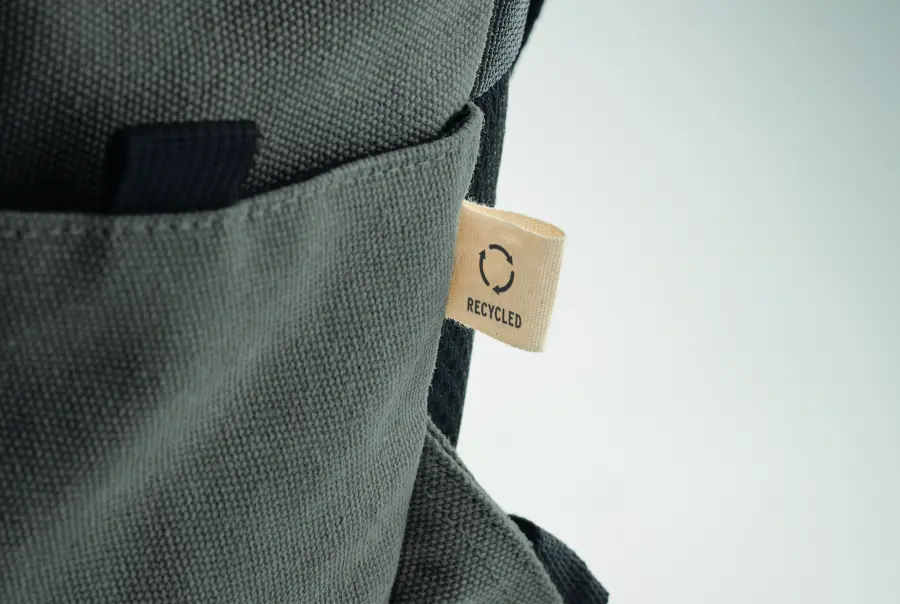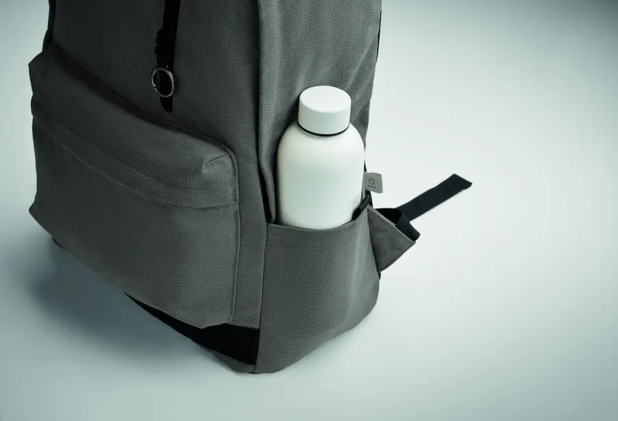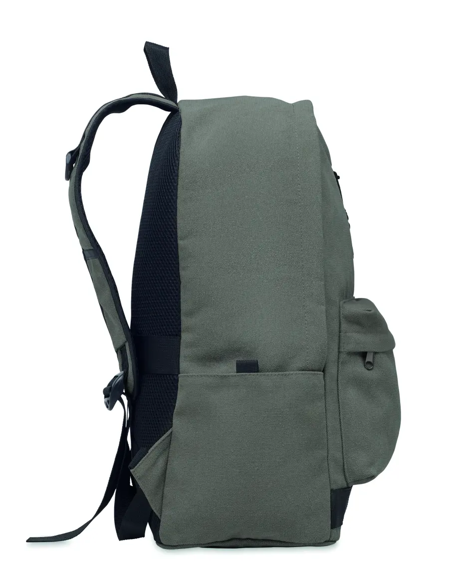 Plecak na laptopa 15 cali z bawełny z prekonsumenckiego recyklingu. Duża przednia kieszeń zapinana na zamek z wewnętrzną przegrodą na laptopa. Mała przednia kieszeń na suwak. Dwie boczne kieszenie wsuwane. Wyściełane plecy i szelki, tylny panel i spód. 450 gr/m².