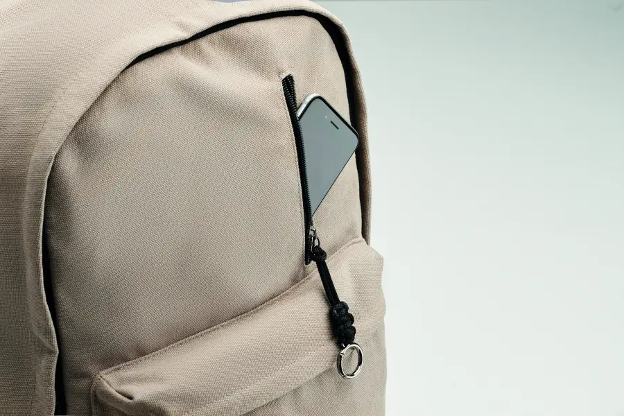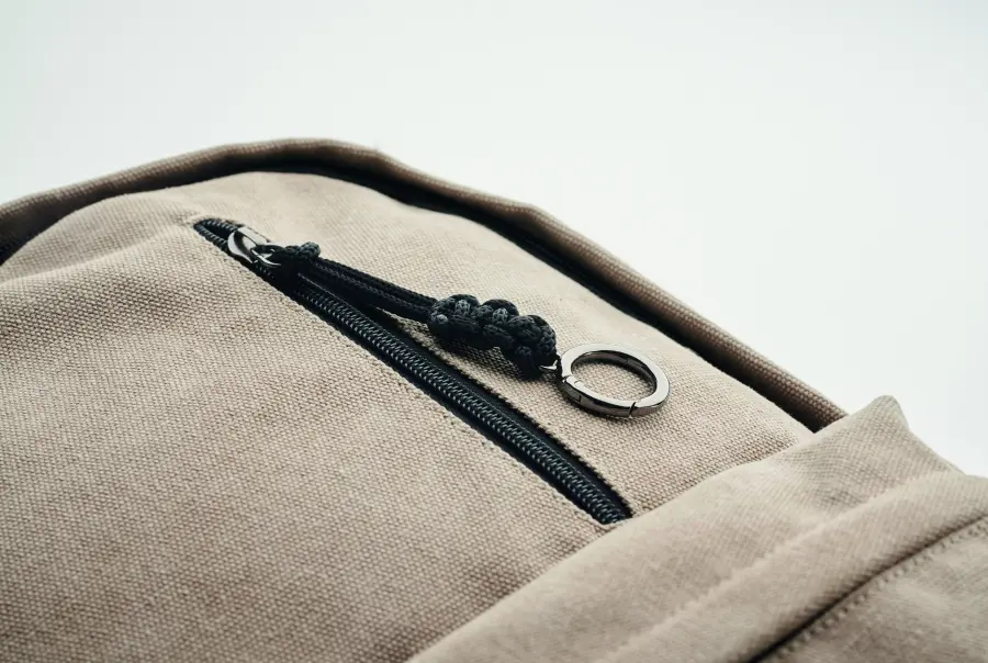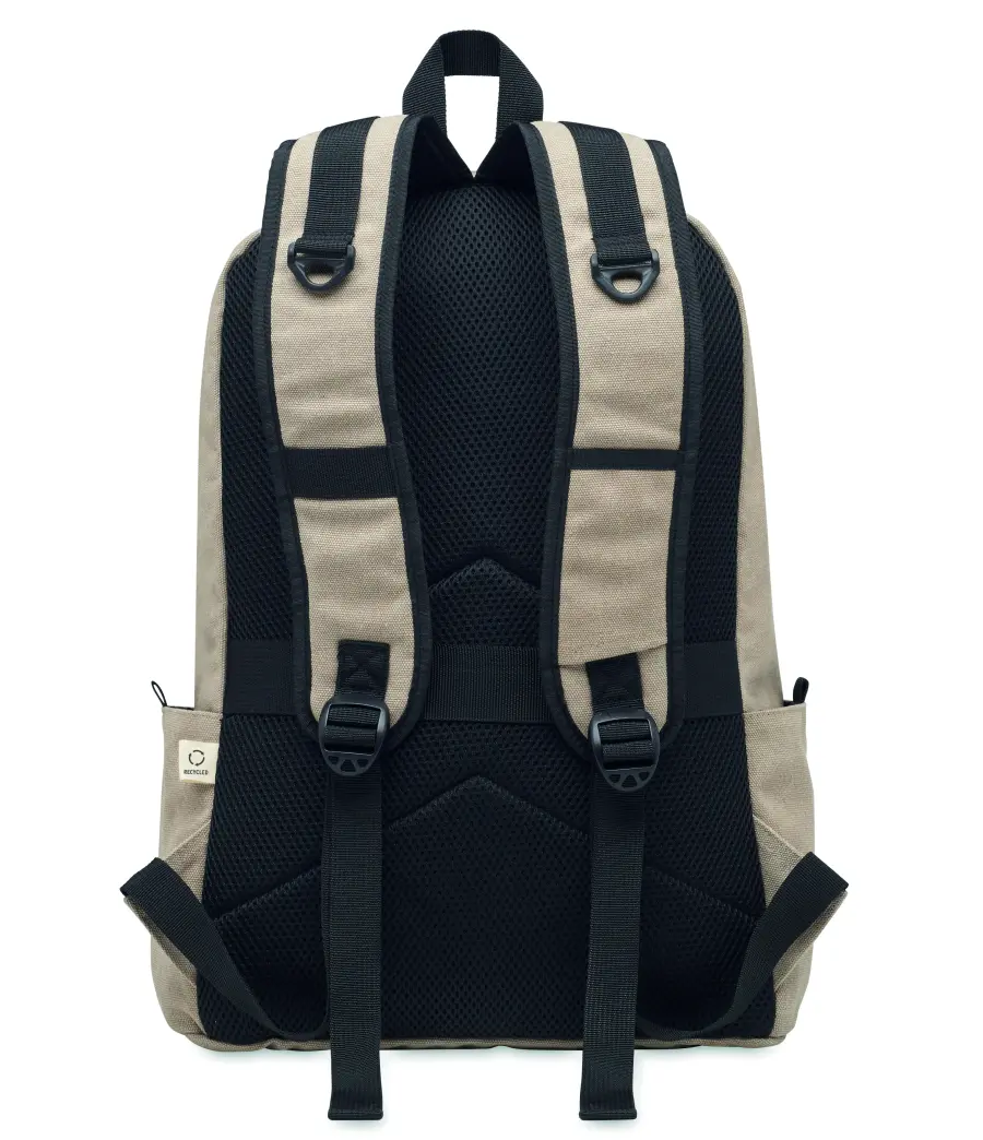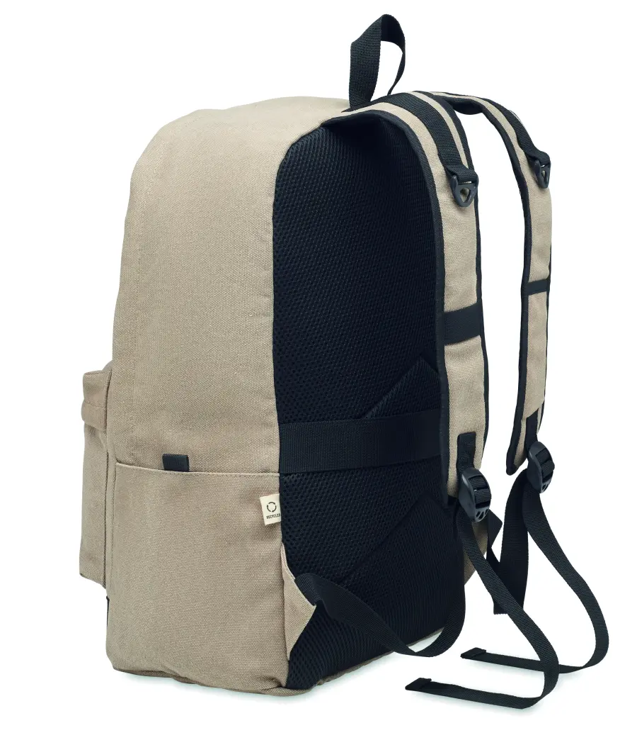 Plecak na laptopa 15 cali z bawełny z prekonsumenckiego recyklingu. Duża przednia kieszeń zapinana na zamek z wewnętrzną przegrodą na laptopa. Mała przednia kieszeń na suwak. Dwie boczne kieszenie wsuwane. Wyściełane plecy i szelki, tylny panel i spód. 450 gr/m².