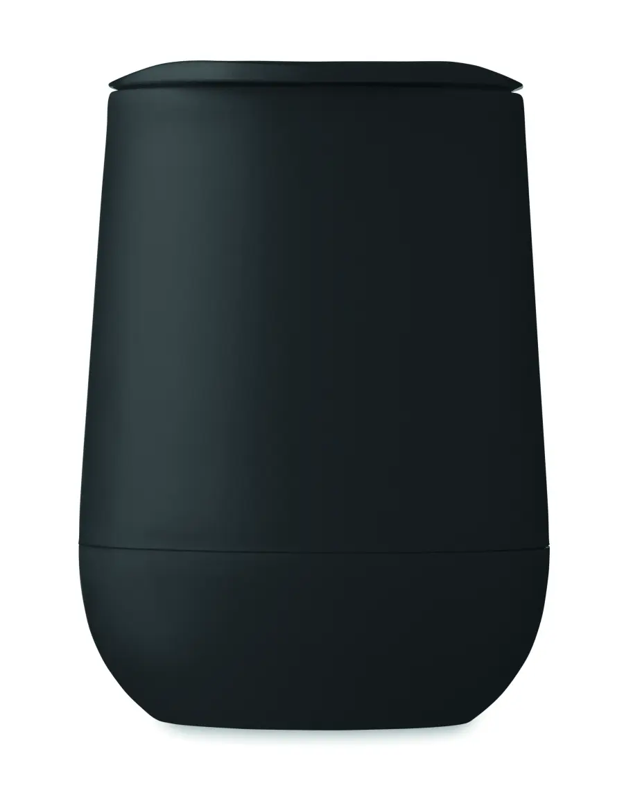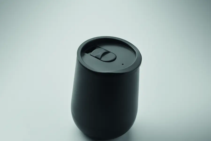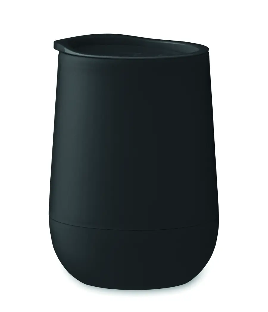 Kubek o podwójnych ściankach z PP z zamykaną pokrywką z ustnikiem z PS i ABS. Pojemność: 300 ml.