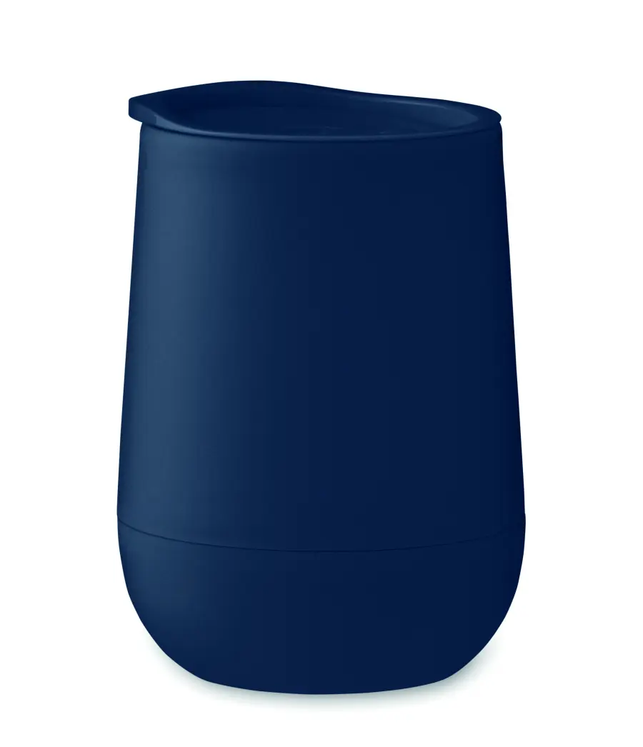 Kubek o podwójnych ściankach z PP z zamykaną pokrywką z ustnikiem z PS i ABS. Pojemność: 300 ml.