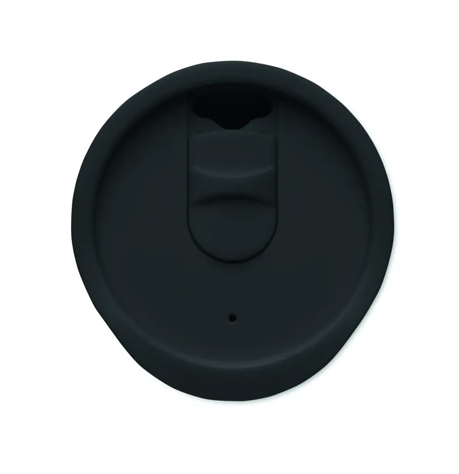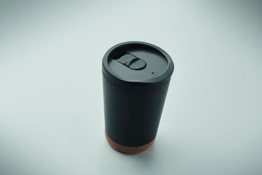 Kubek o podwójnych ściankach z PP z korkową podstawą i zamykaną pokrywką z ustnikiem z PS. Pojemność: 300 ml.