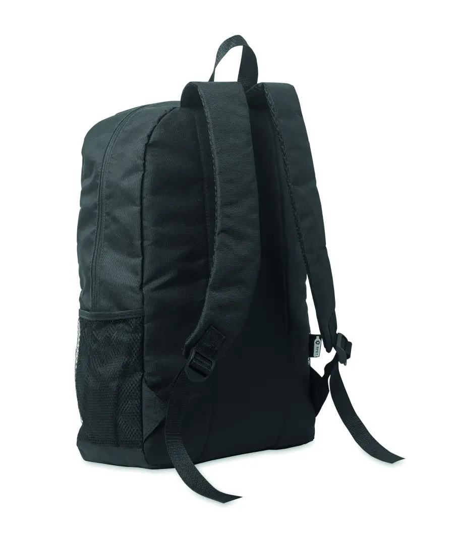 Plecak z poliestru 600D RPET z ozdobnym sznurkiem i przednią kieszenią zapinaną na zamek. Siateczkowe kieszenie po obu stronach.