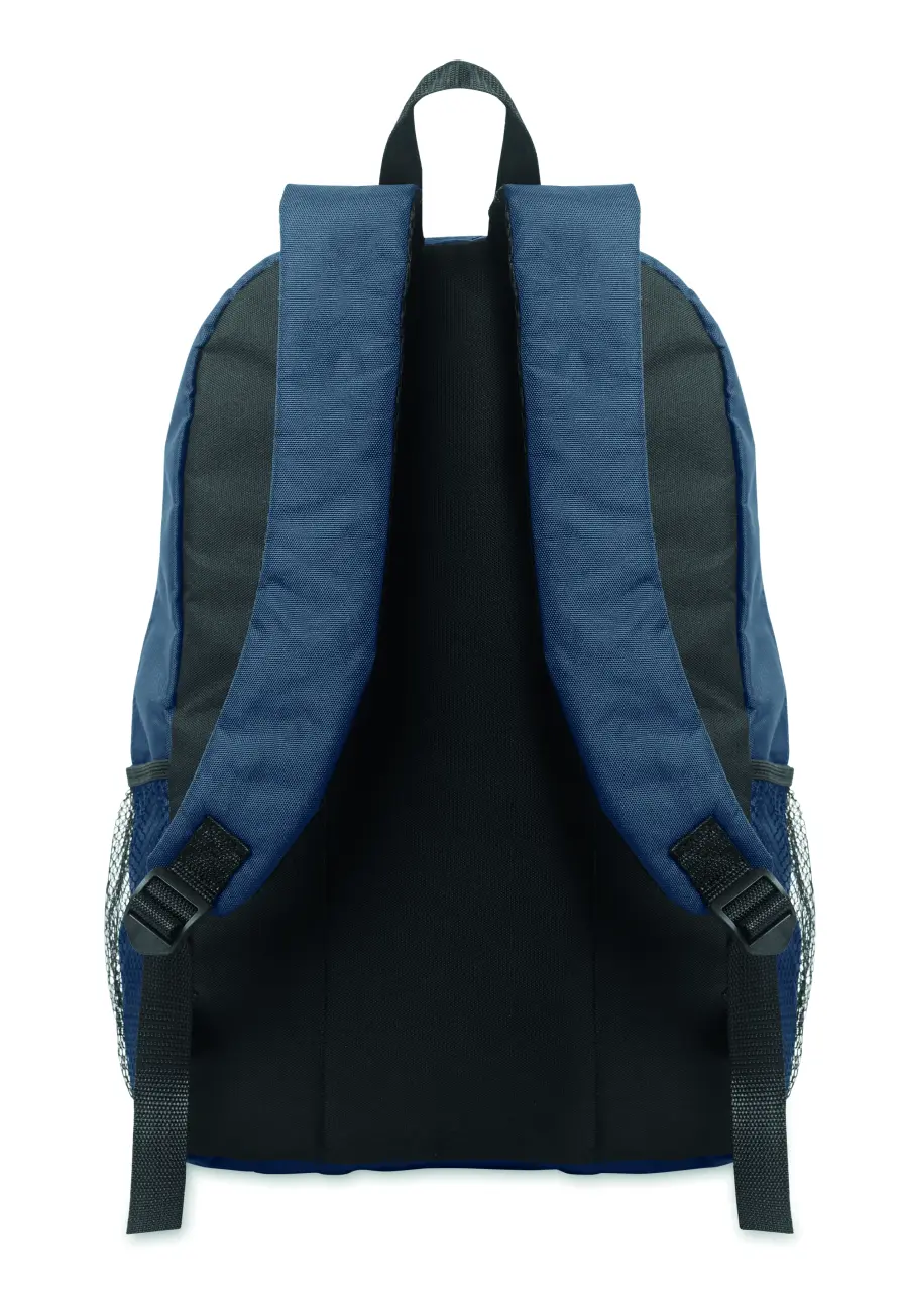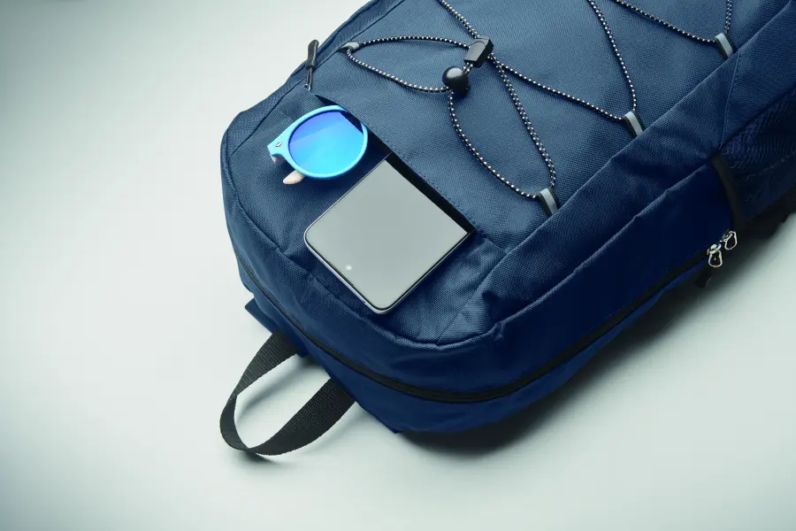 Plecak z poliestru 600D RPET z ozdobnym sznurkiem i przednią kieszenią zapinaną na zamek. Siateczkowe kieszenie po obu stronach.
