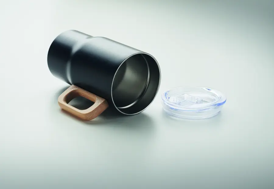 Kubek z podwójnymi ściankami z recyklingowanej stali nierdzewnej (90% stali nierdzewnej z recyklingu i 10% stali nierdzewnej) z drewnianym uchwytem. Pojemność: 350 ml.