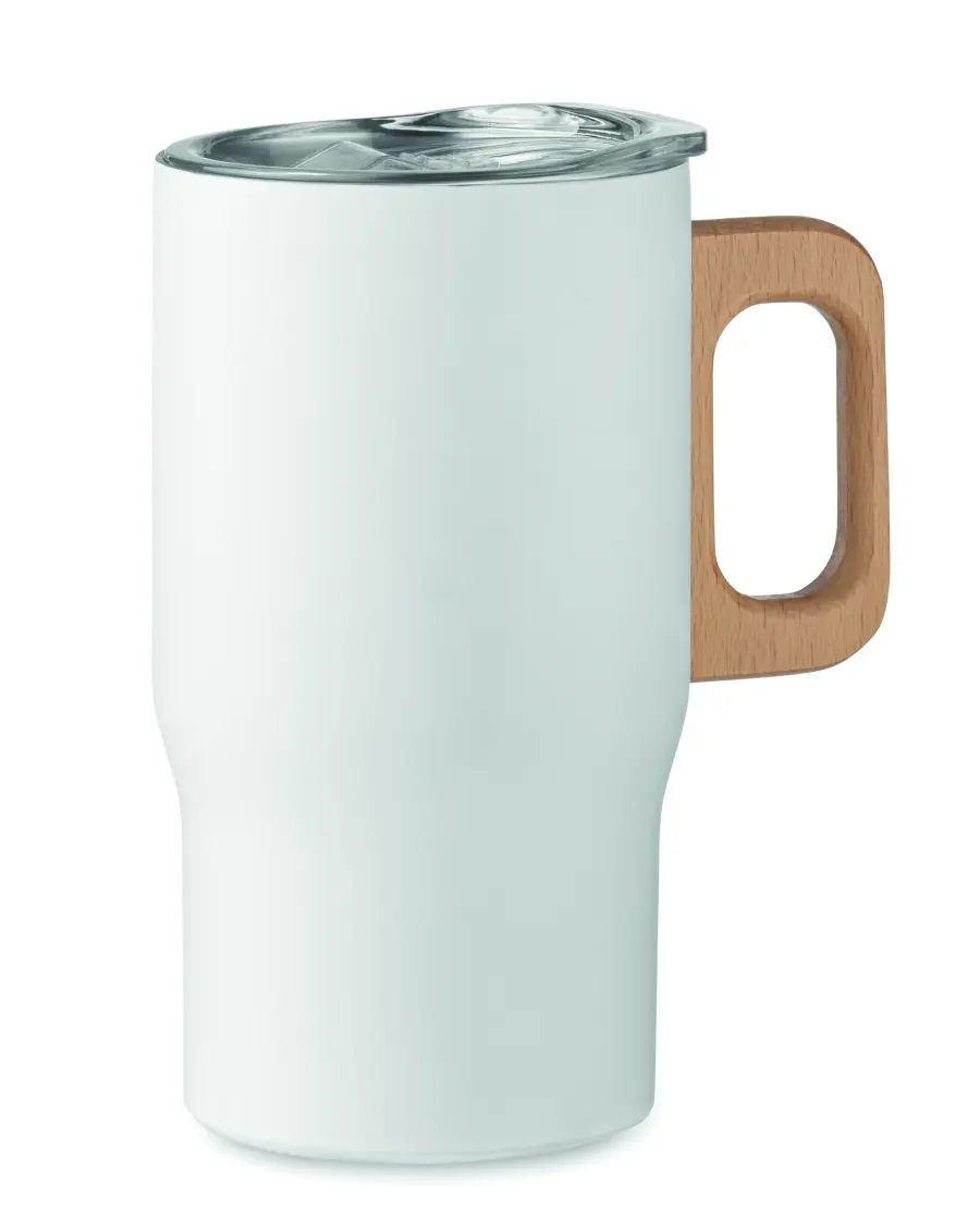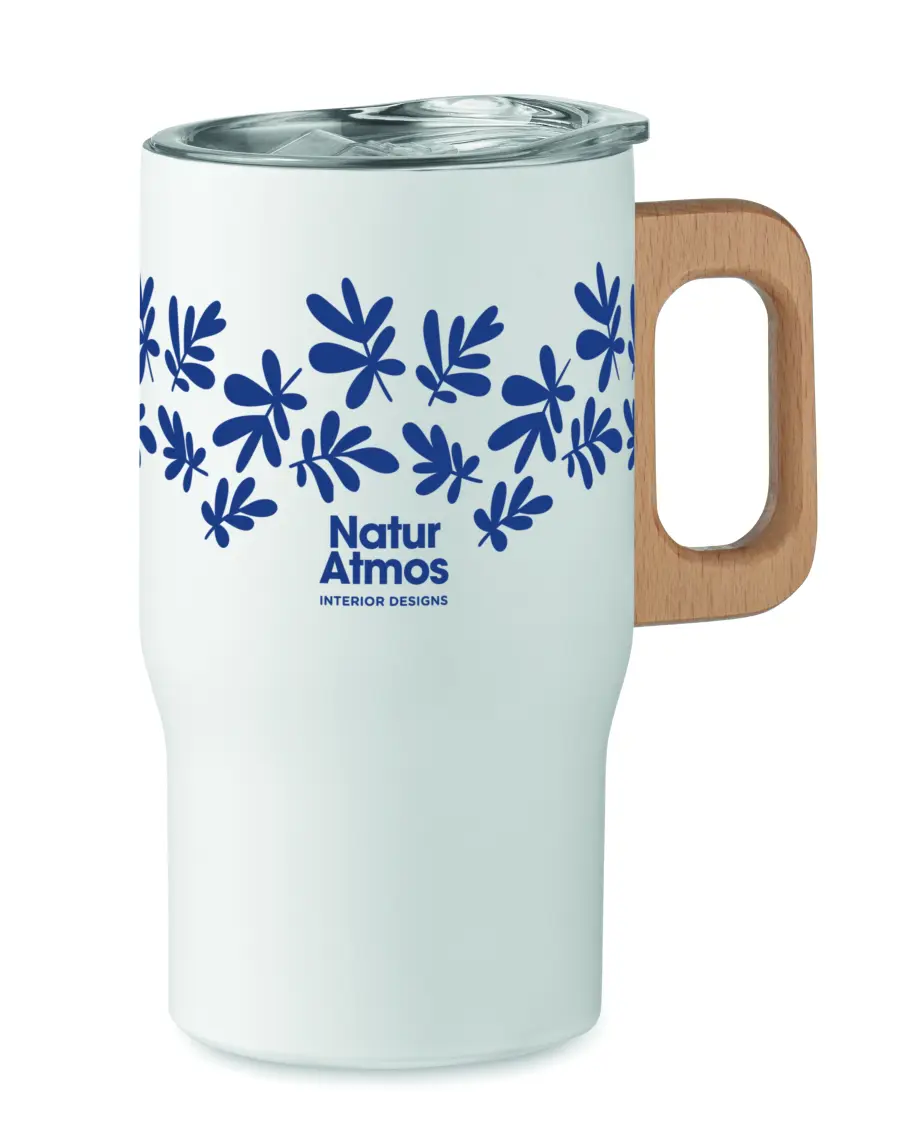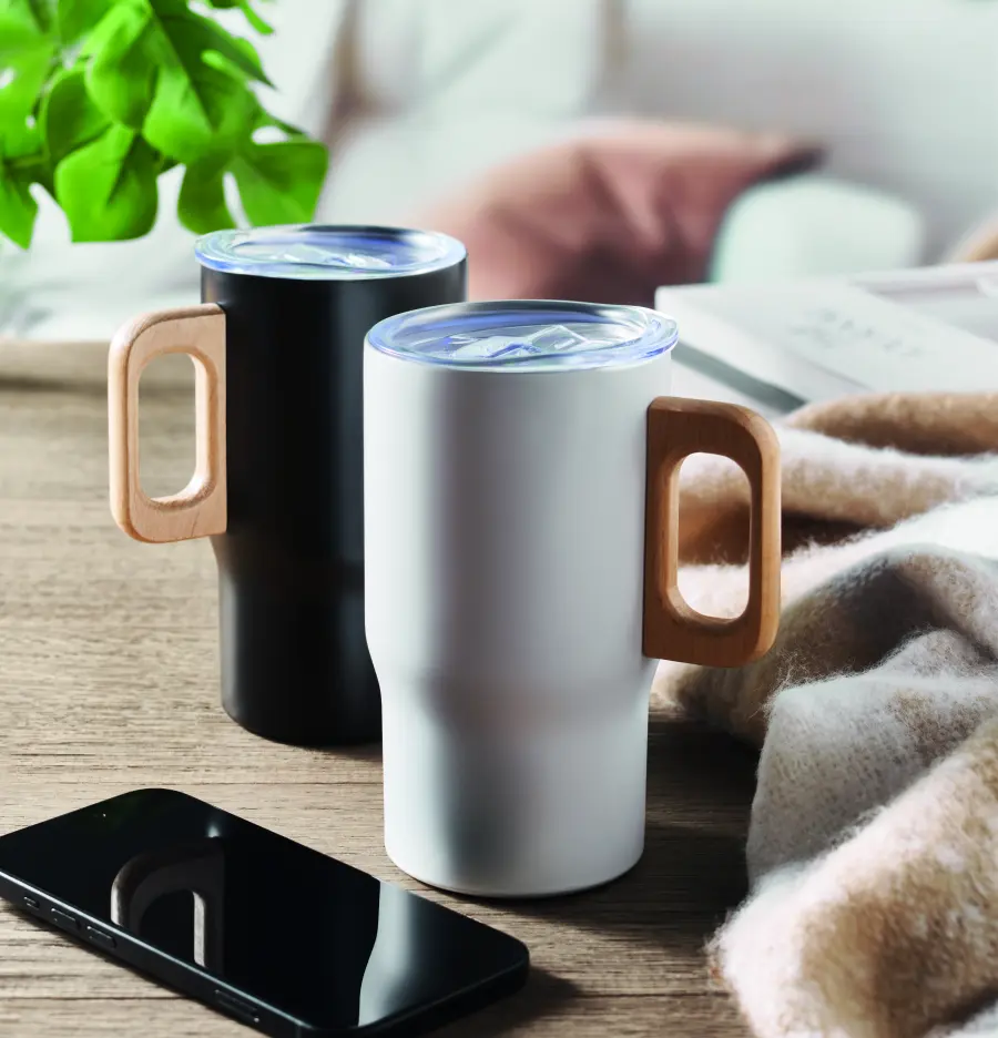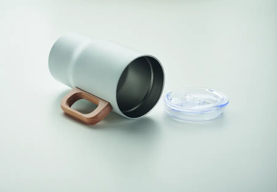 Kubek z podwójnymi ściankami z recyklingowanej stali nierdzewnej (90% stali nierdzewnej z recyklingu i 10% stali nierdzewnej) z drewnianym uchwytem. Pojemność: 350 ml.