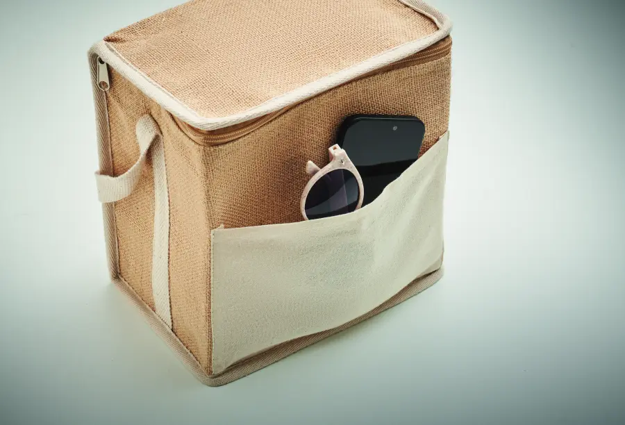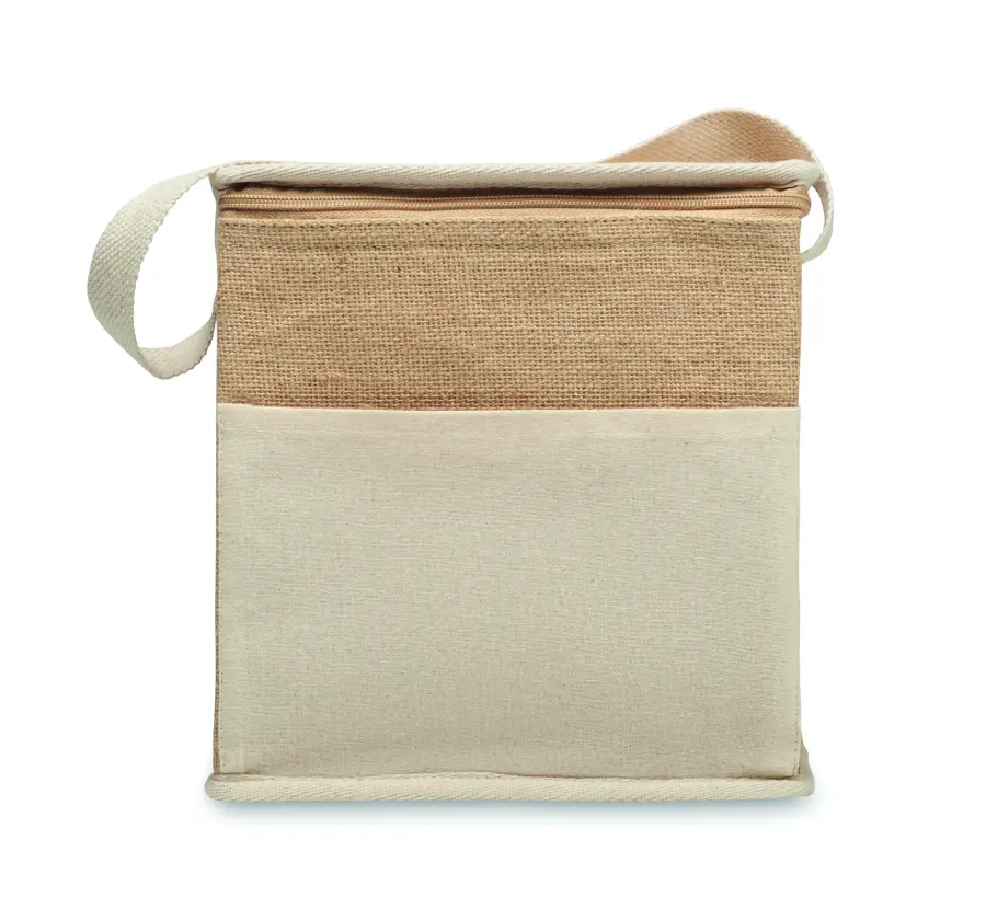 Jutowa torba chłodząca z bawełnianym paskiem i przednią kieszenią na butelki 6x0 ,5 l. Materiał izolacyjny: 3 mm folia aluminiowa. Pojemność 3 l.