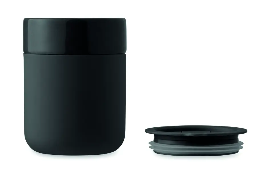 Ceramiczny kubek ze zdejmowalnym silikonowym rękawem i pokrywką z PP. Pojemność: 330 ml.
