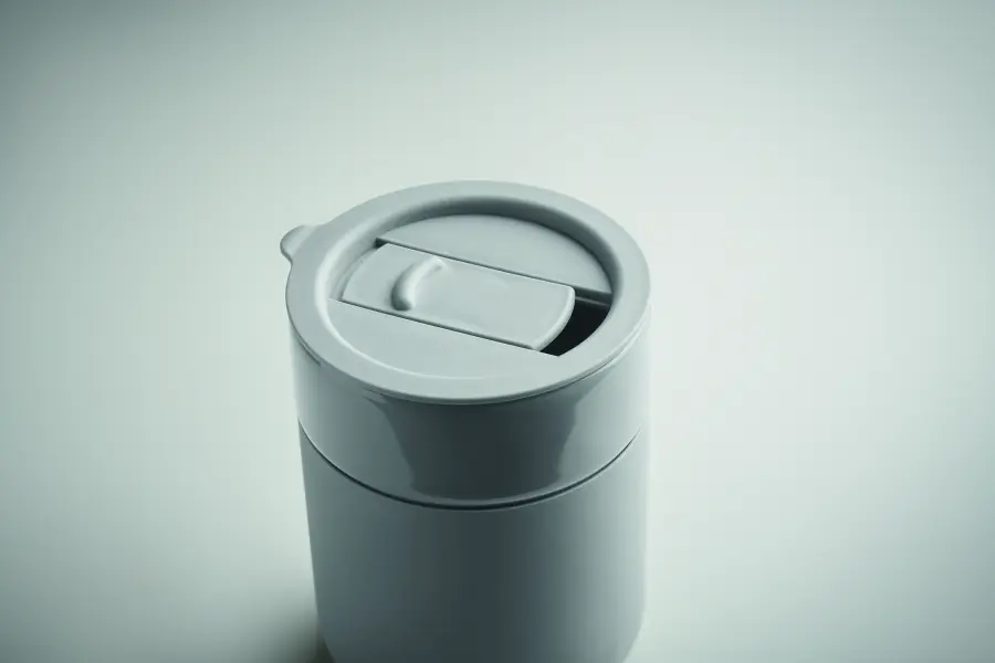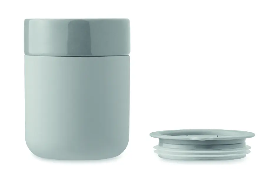Ceramiczny kubek ze zdejmowalnym silikonowym rękawem i pokrywką z PP. Pojemność: 330 ml.