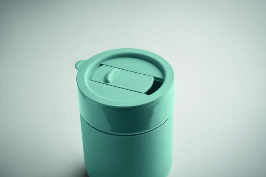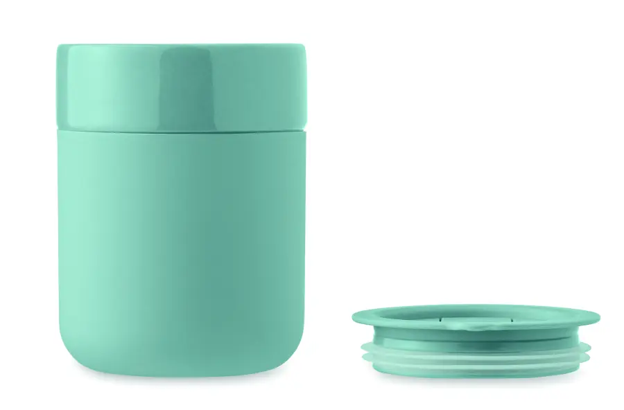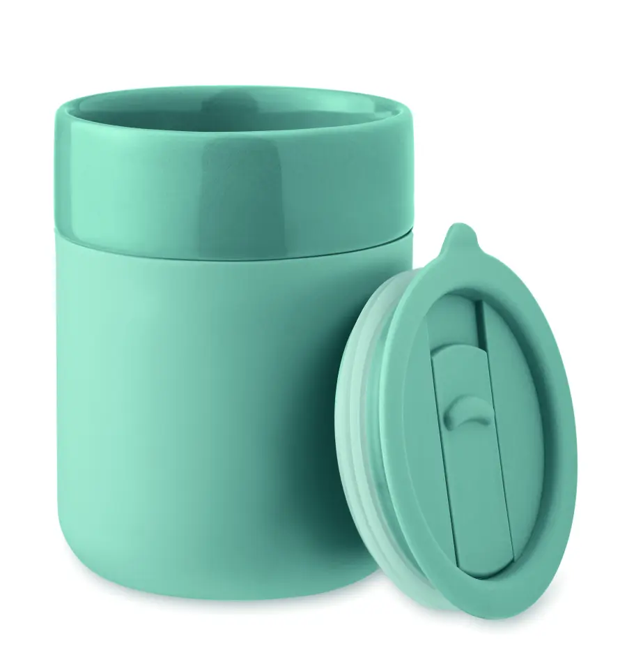 Ceramiczny kubek ze zdejmowalnym silikonowym rękawem i pokrywką z PP. Pojemność: 330 ml.