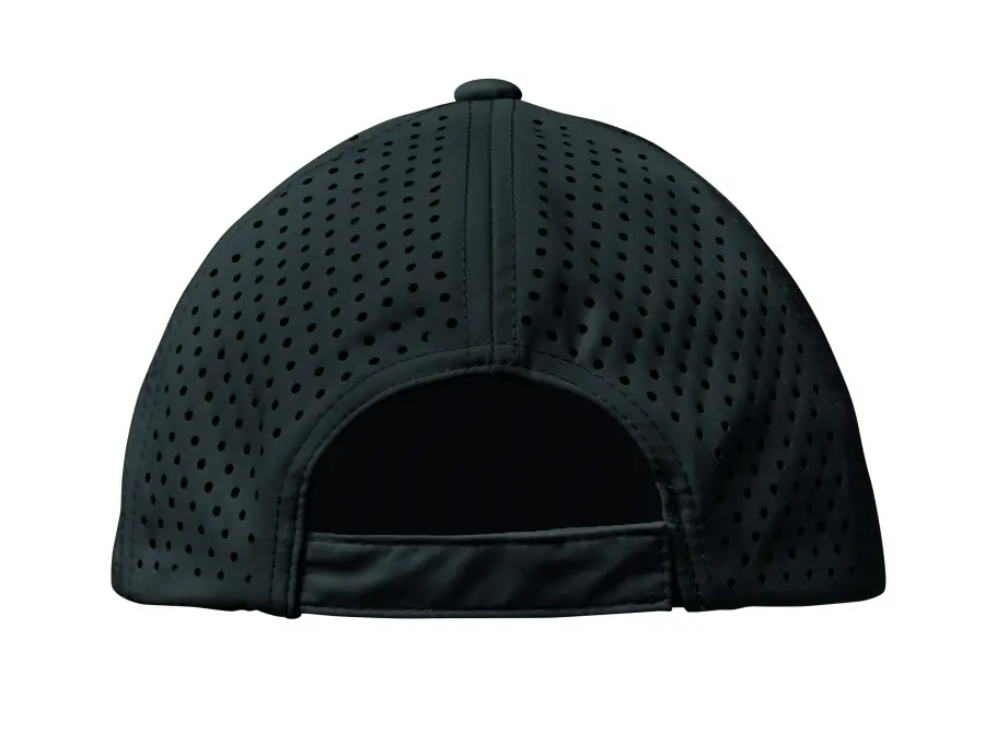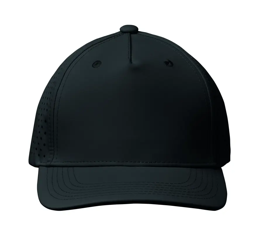 5-panelowa czapka z poliestru z regulowanym zapięciem na rzep i laserowo perforowanymi otworami z 2 obszytymi oczkami w dopasowanym kolorze. Produkt jest szybkoschnący, odporny na pot i wodę. 130 gr/m²