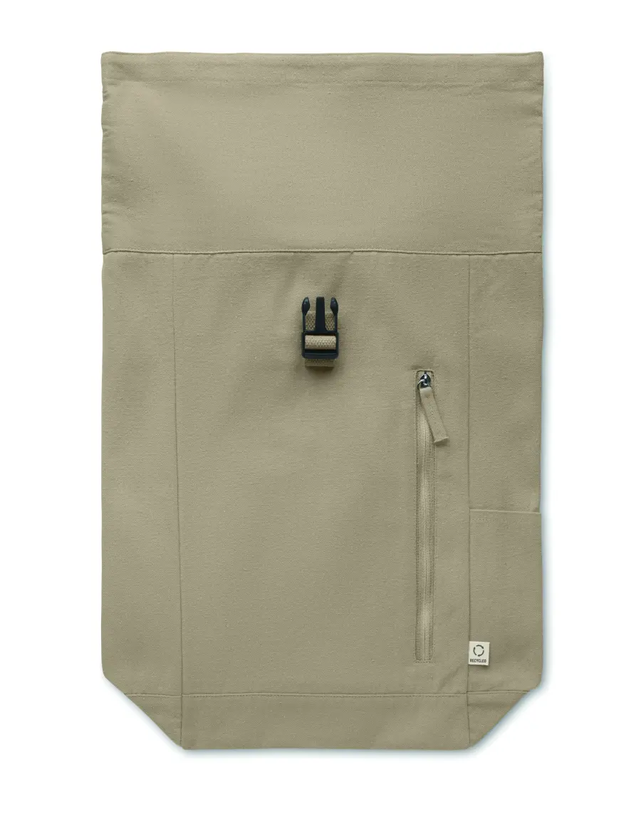 Plecak z zapięciem na rzep wykonany z bawełny z recyklingu o gramaturze 390 gr/m² (80%) i poliestru z recyklingu (20%). Przednia kieszeń zapinana na zamek.