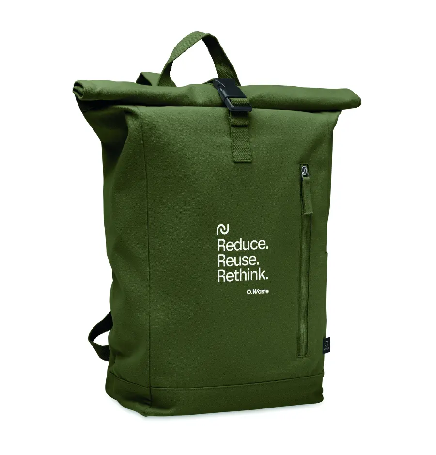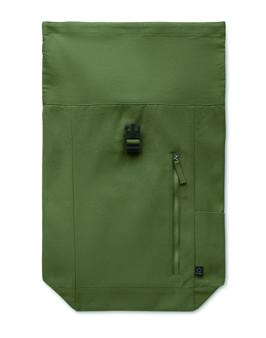 Plecak z zapięciem na rzep wykonany z bawełny z recyklingu o gramaturze 390 gr/m² (80%) i poliestru z recyklingu (20%). Przednia kieszeń zapinana na zamek.