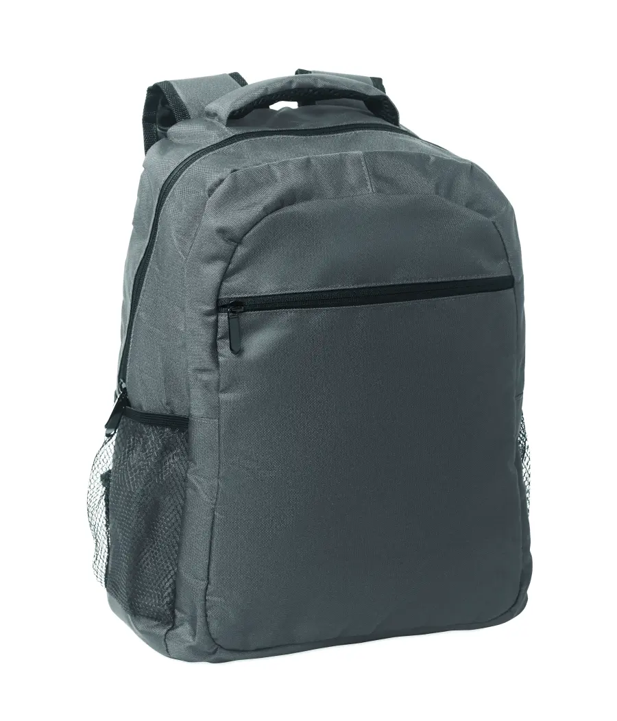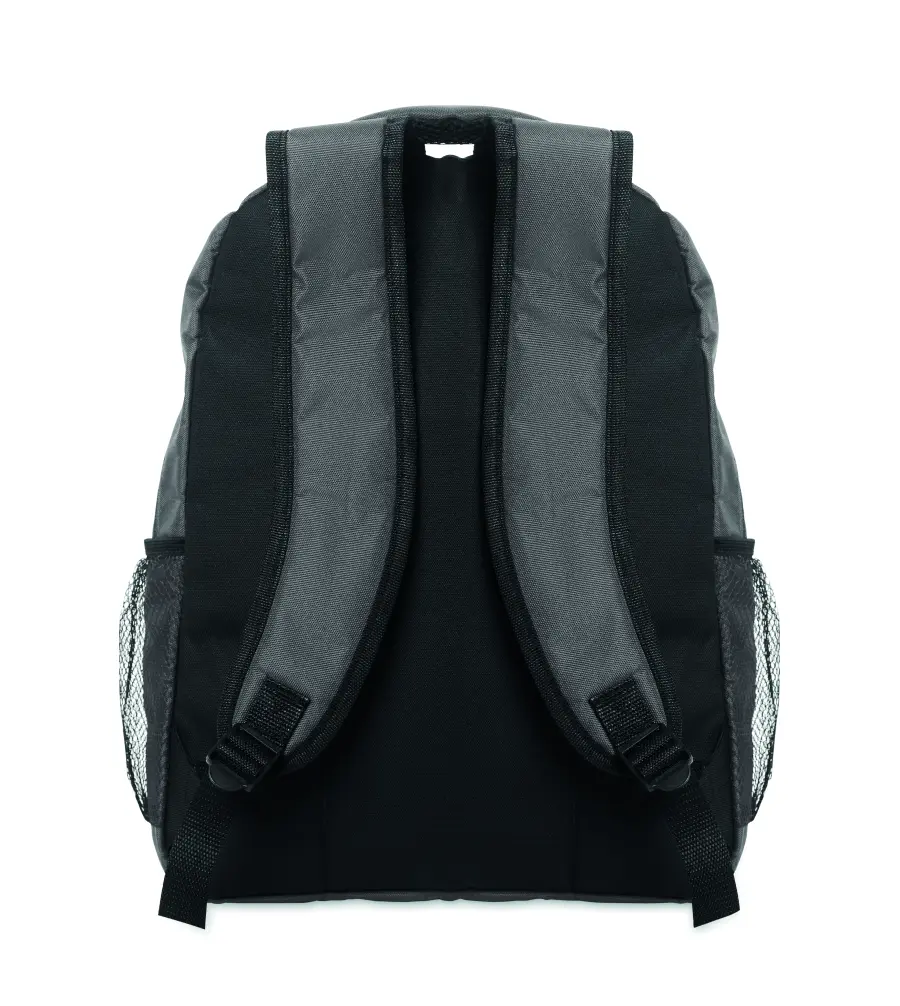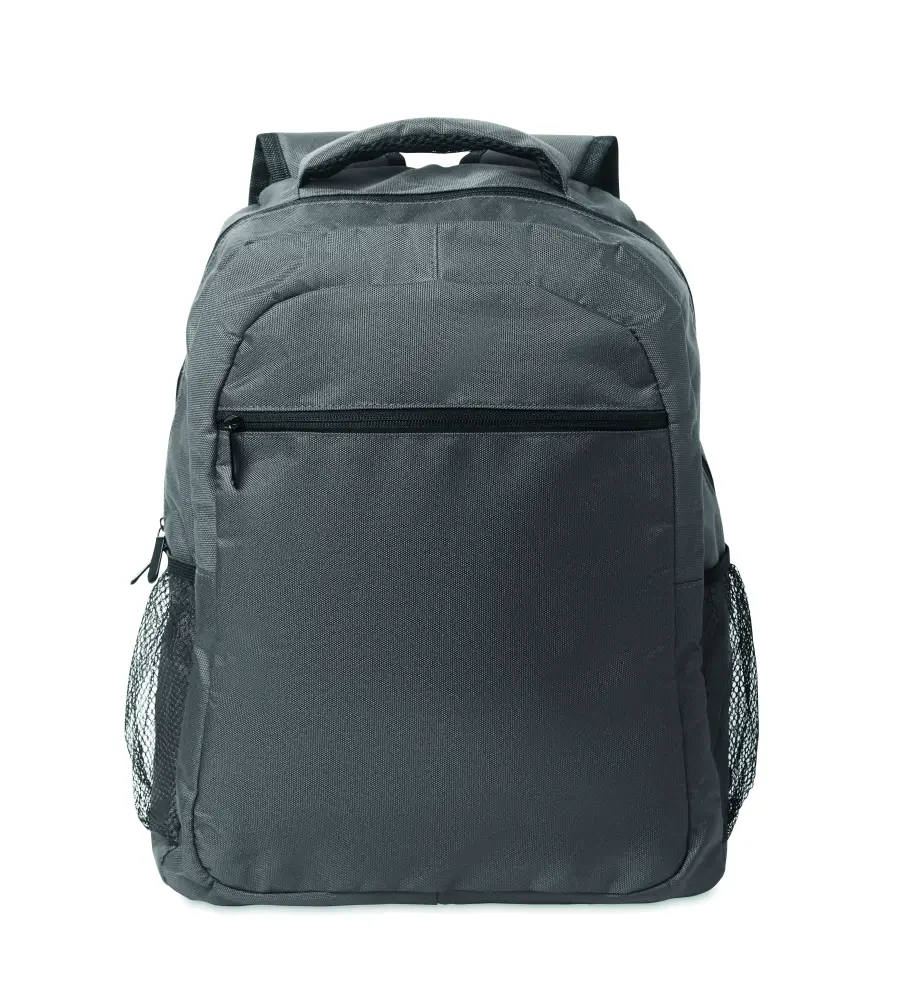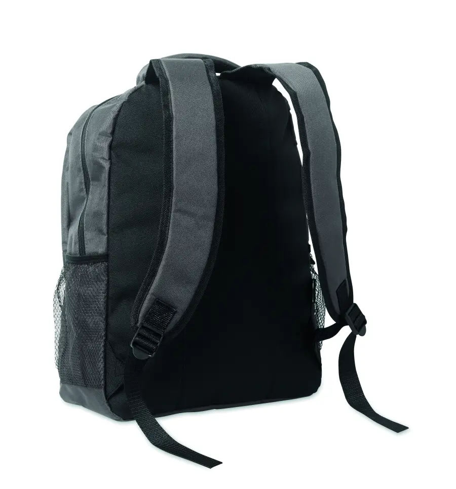 Plecak na laptopa 15 cali z poliestru 600D RPET z wyściełaną przegrodą na laptopa wewnątrz, kieszeniami z siatki po obu stronach i przednią kieszenią zapinaną na zamek.