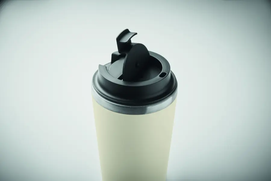 Kubek z podwójną ścianką. Zewnętrzna z PP i wewnętrzna ze stali nierdzewnej z recyklingu (90% stali nierdzewnej z recyklingu i 10% stali nierdzewnej) z ceramiczną powłoką wewnętrzną. Nie przecieka. Pojemność: 350 ml.