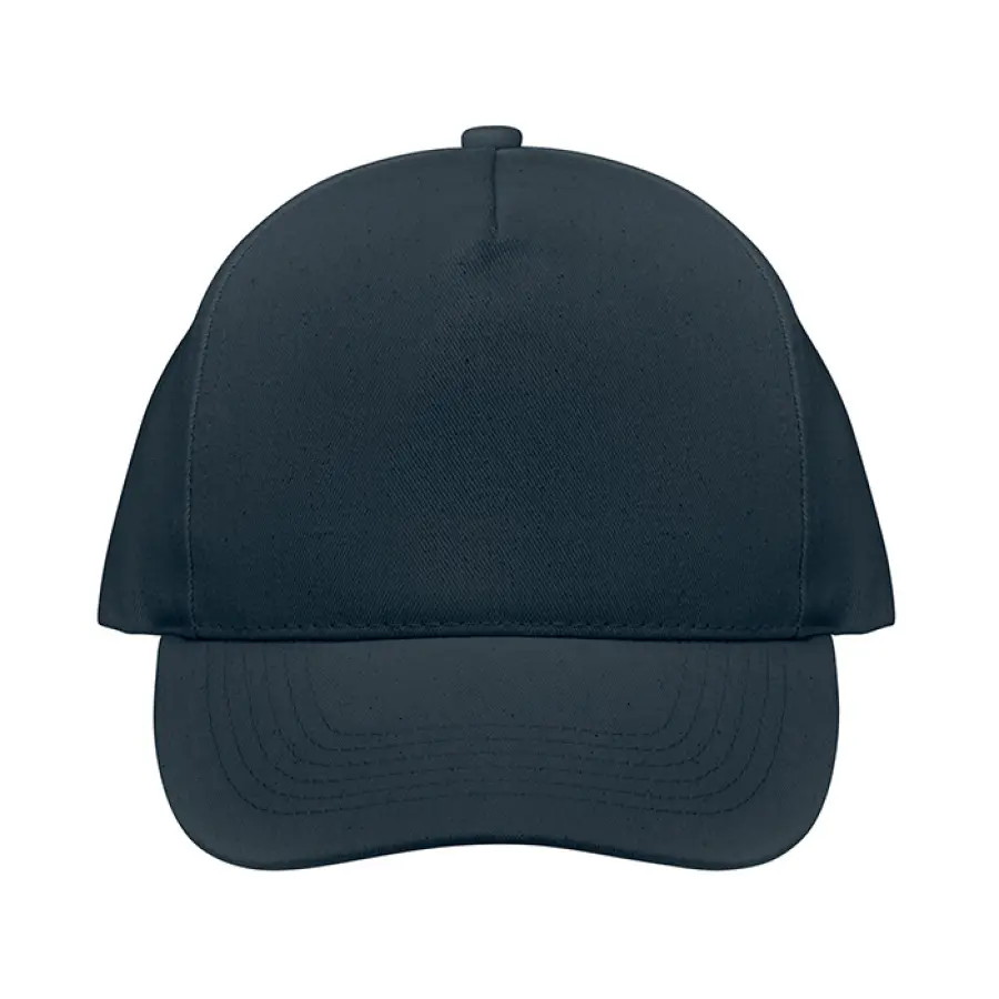 5-panelowa czapka z daszkiem z organicznej szczotkowanej bawełny 250 gr/m² z metalowym regulowanym paskiem z tyłu zapinanym na klamrę. 4 metalowe oczka z dopasowanymi kolorystycznie otworami wentylacyjnymi.