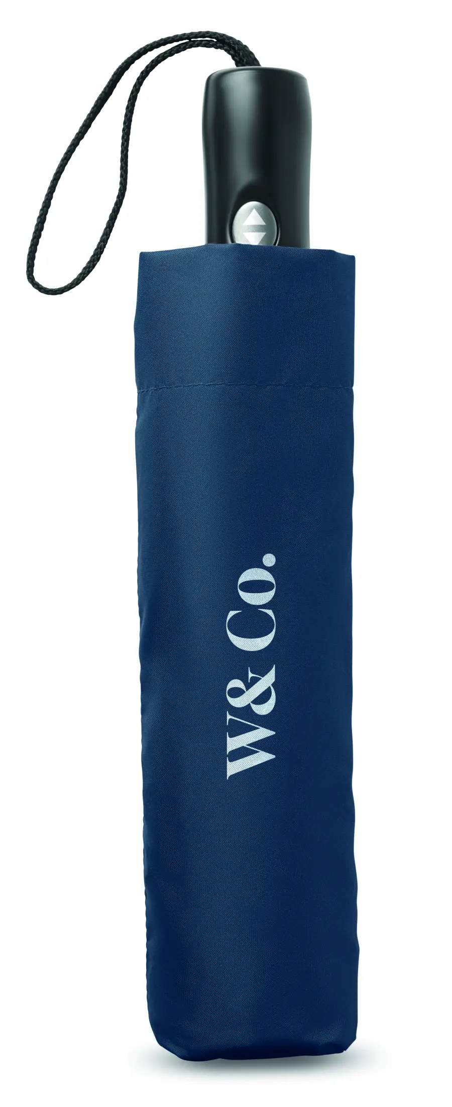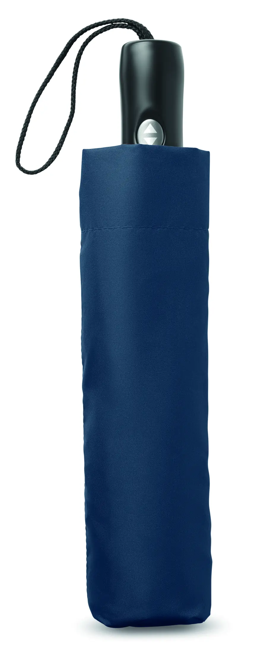 3-krotnie składany parasol 23'' z materiału 190T pongee, automatycznie otwierany/zamykany. Stalowy, chromowany trzon, żebra z włókna szklanego. Czarna rączka z ABS z przyciskiem. Dopasowany pokrowiec.