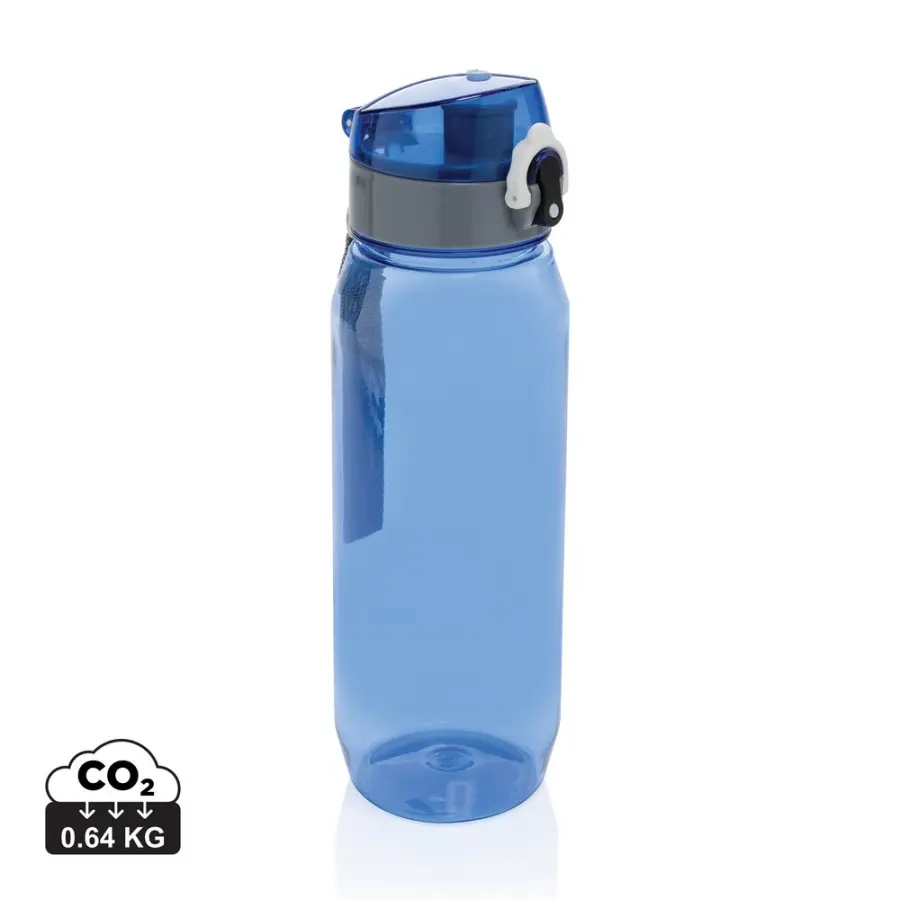 Butelka sportowa 800 ml, uchwyt, wykonana z RPET, nie wymaga obsługi oburącz, całkowita zawartość materiałów z recyklingu obliczona na podstawie wagi całkowitej przedmiotu: 73%, wyłącznie mycie ręczne, zalecana wyłącznie do zimnej wody, w pudełku z papieru kraftowego z certyfikatem FSC®, ślad węglowy produktu: 0,64 kg CO2