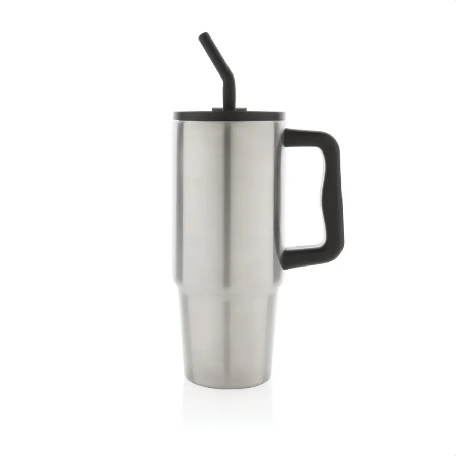 Kubek termiczny 900 ml, wykonany ze stali nierdzewnej z recyklingu, podwójne ścianki ze stali nierdzewnej z próżnią pomiędzy, zakręcane wieczko z dziubkiem i słomką, zalecane mycie ręczne, ślad węglowy produktu: 0 kg CO2