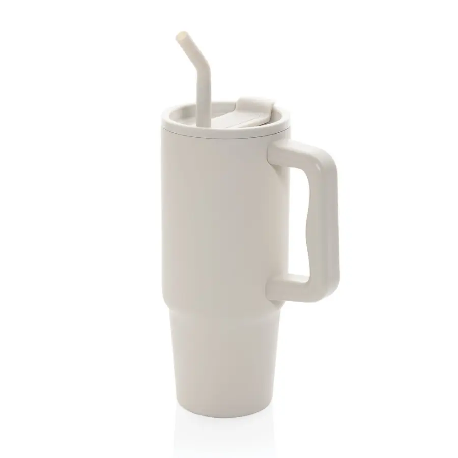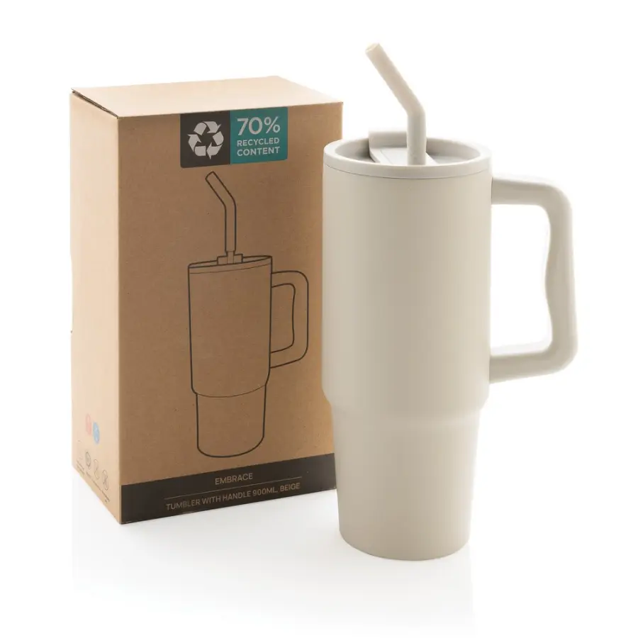 Kubek termiczny 900 ml, wykonany ze stali nierdzewnej z recyklingu, podwójne ścianki ze stali nierdzewnej z próżnią pomiędzy, zakręcane wieczko z dziubkiem i słomką, zalecane mycie ręczne, ślad węglowy produktu: 0 kg CO2