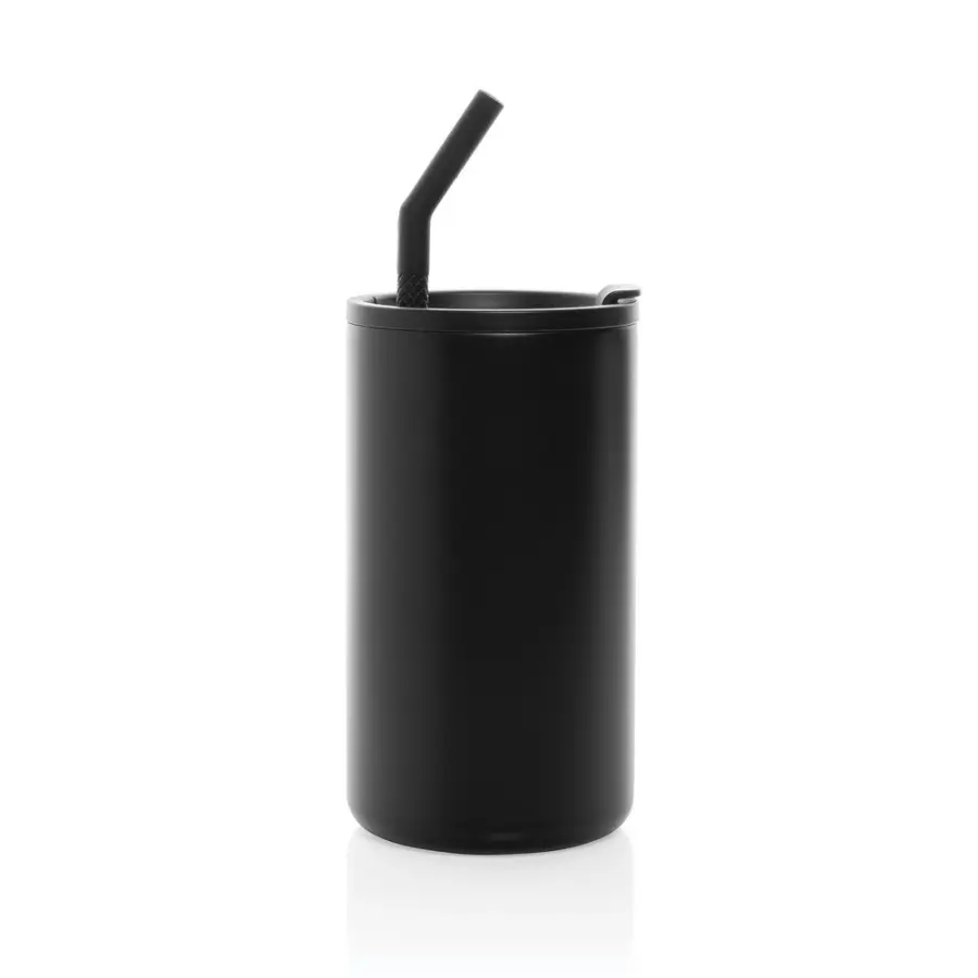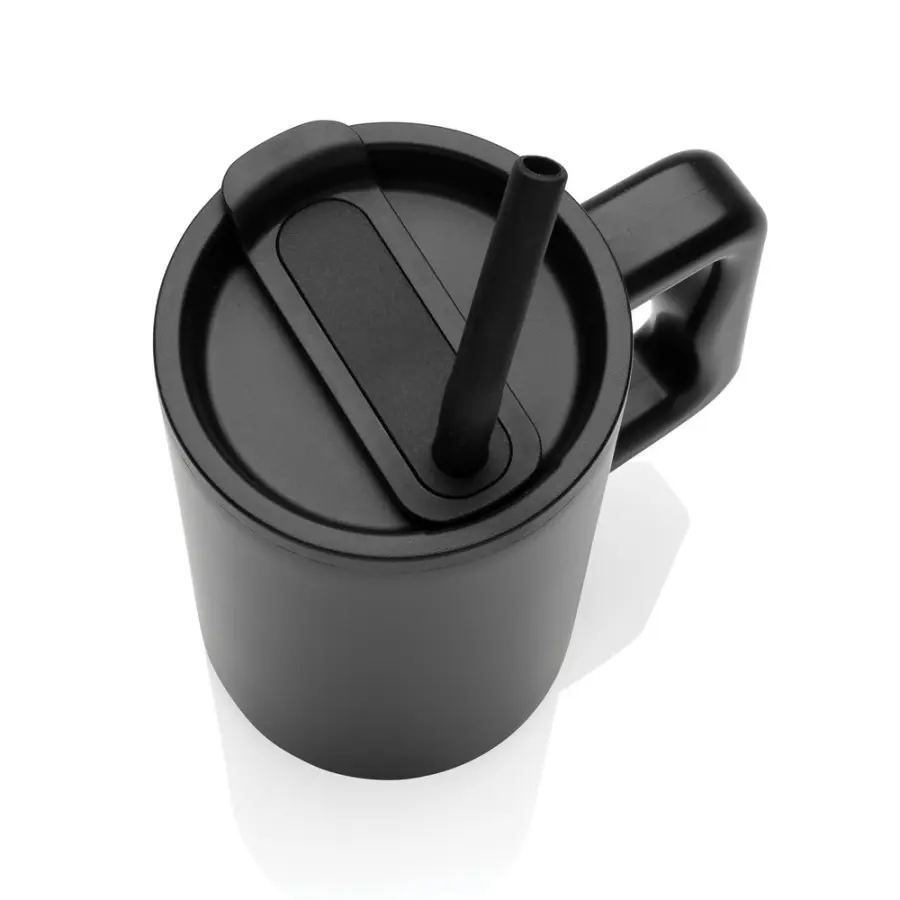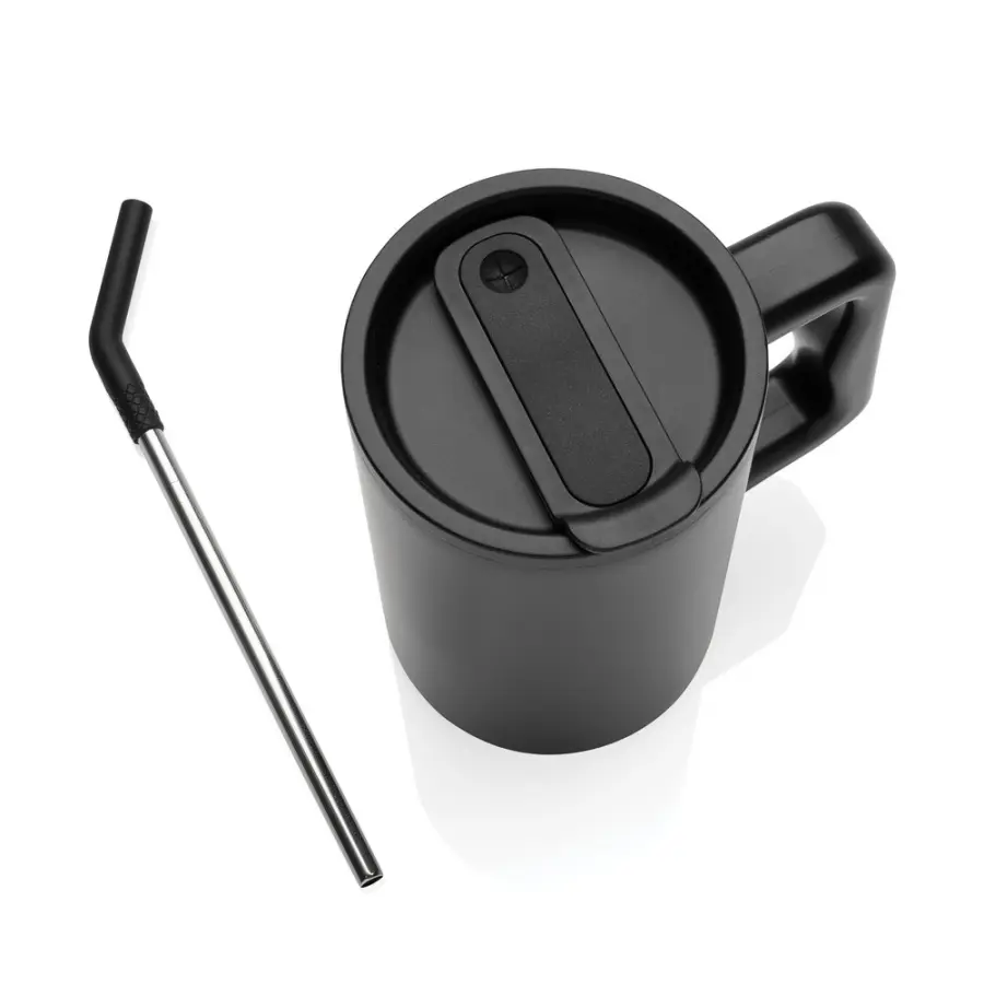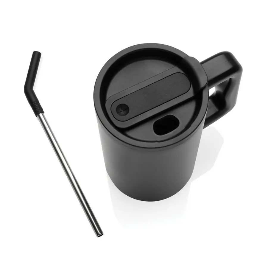 Kubek termiczny 800 ml, posiada słomkę z silikonową nakładką, zakręcane wieczko, wykonany ze stali nierdzewnej z recyklingu, podwójne ścianki ze stali nierdzewnej z próżnią między ściankami, dzięki czemu zachowuje funkcje termosu i długo utrzymuje temperaturę nie oddając jej na zewnątrz, zalecane mycie ręczne