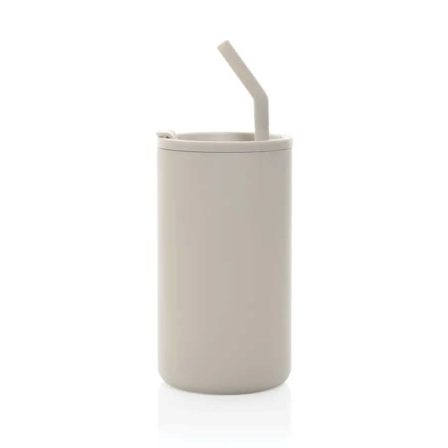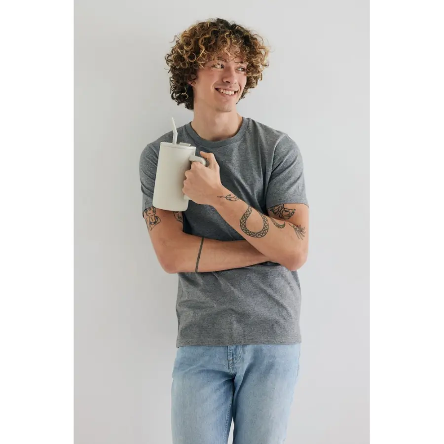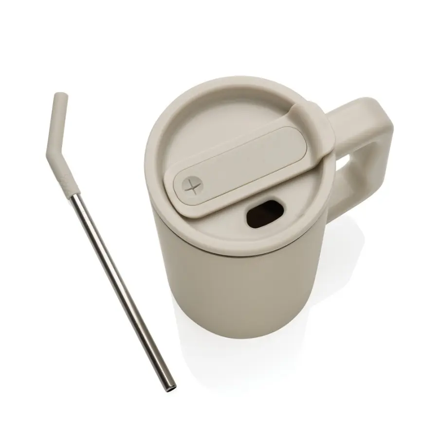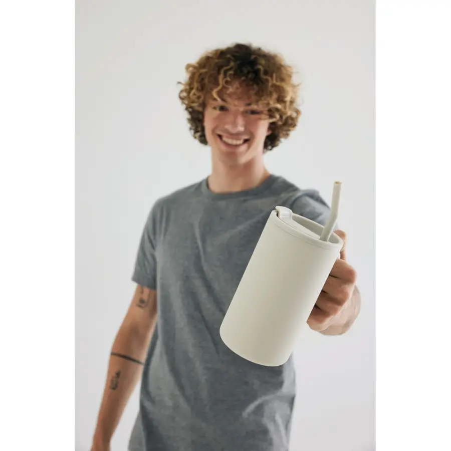 Kubek termiczny 800 ml, posiada słomkę z silikonową nakładką, zakręcane wieczko, wykonany ze stali nierdzewnej z recyklingu, podwójne ścianki ze stali nierdzewnej z próżnią między ściankami, dzięki czemu zachowuje funkcje termosu i długo utrzymuje temperaturę nie oddając jej na zewnątrz, zalecane mycie ręczne
