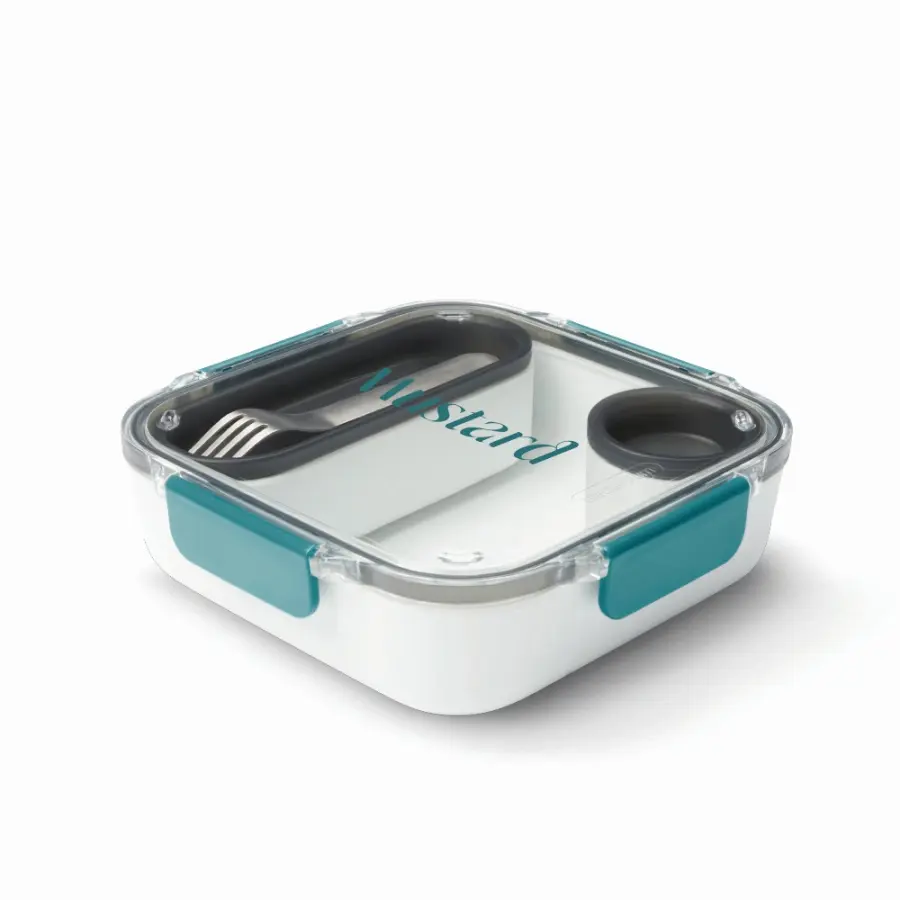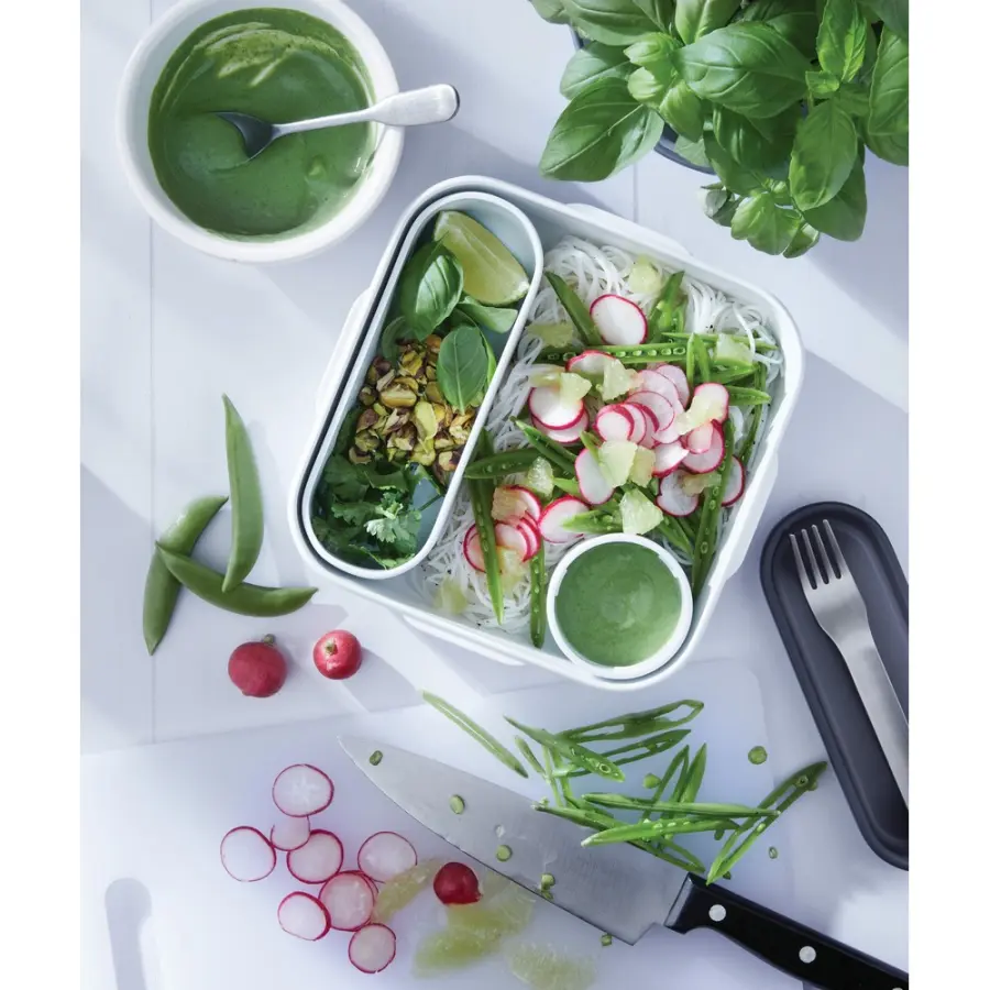 Pudełko śniadaniowe, zawiera wewnętrzny pojemnik, pojemnik na sos z miejscem do dekoracji w pokrywie widelec ze stali nierdzewnej, można myć w zmywarce i używać w kuchence mikrofalowej