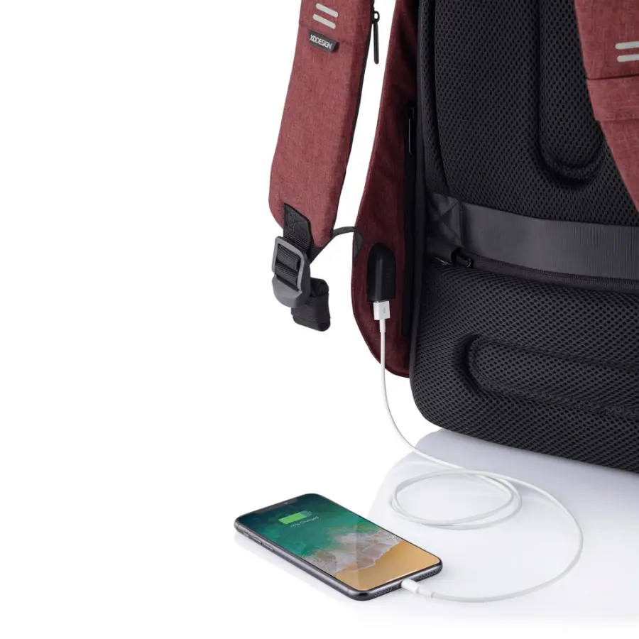 Plecak chroniący przed kieszonkowcami Bobby Hero Regular, wodoodporny i odporny na przecięcia materiał, wykonany z materiału RPET, ukryte zamki i kieszenie, wewnątrz miękkie przegrody na laptopa 15,6" i tablet do 12,9", zintegrowany port USB do ładowania telefonów (power-bank nie jest dołączony), odblaskowe paski zwiększające widoczność, pasek do zamocowania na walizce, wzór zastrzeżony®, ślad węglowy produktu: 6,68 kg CO2