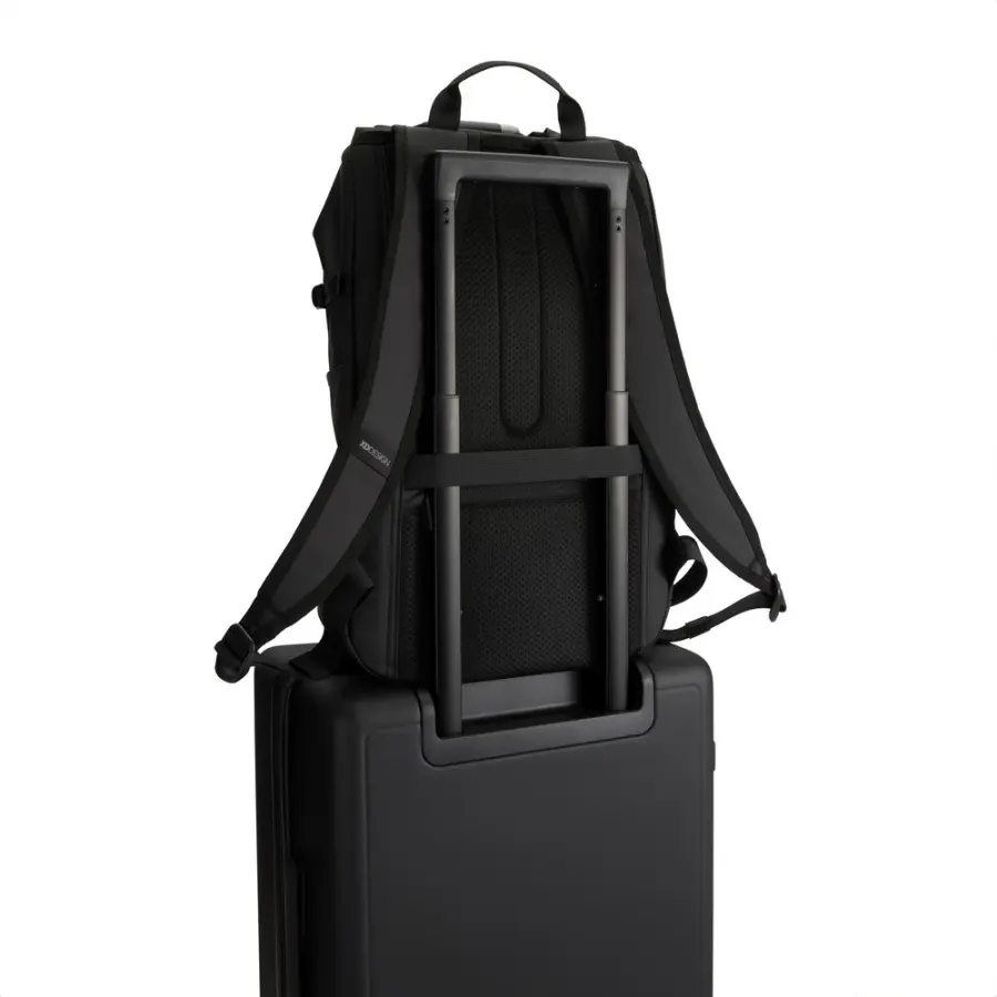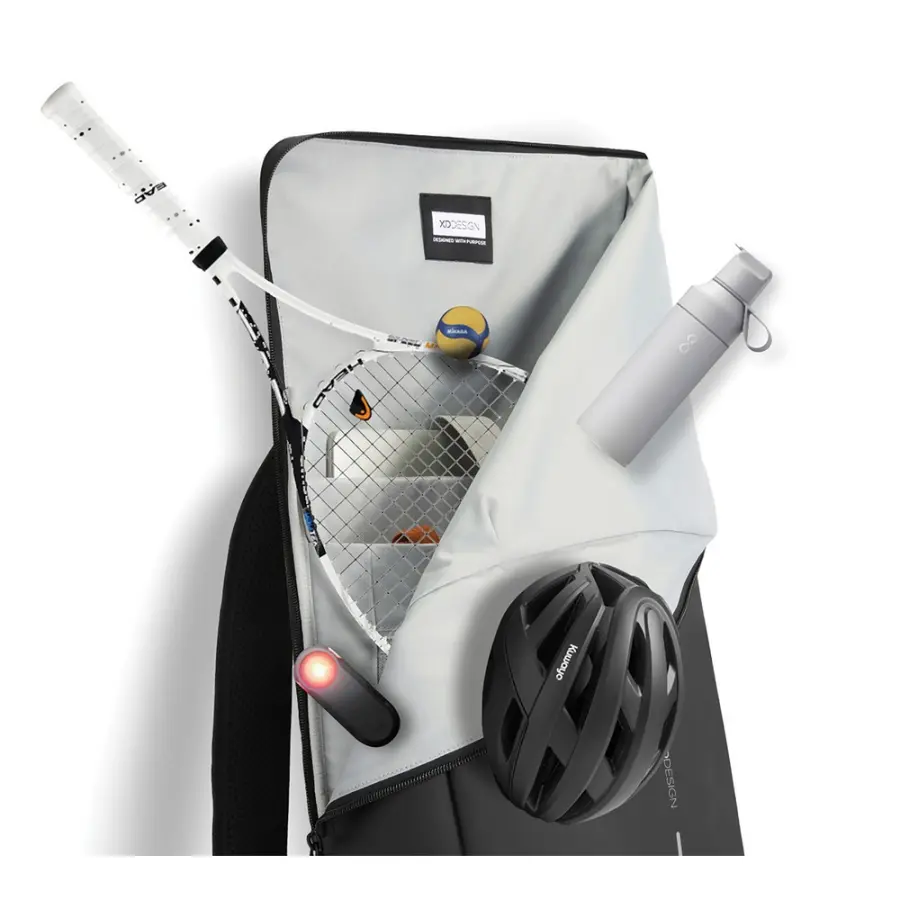 Plecak chroniący przed kieszonkowcami, zwijana przegroda główna i zamek szyfrowy wzmocniony stalą umożliwiający całkowite zamknięcie plecaka, zamek może posłużyć również do przypięcia plecaka do stałego obiektu, ukryte kieszenie do przechowywania dokumentów i kart kredytowych z tyłu torby oraz w pasku na ramię z ochroną RFID, kieszeń boczna, odpinana elastyczna siatka na sprzęt sportowy w komplecie, wewnątrz usztywnione przegrody na laptopa 16" lub tablet, siateczkowe kieszenie na inne przedmioty osobiste, całkowita zawartość materiałów z recyklingu obliczona w oparciu o wagę całkowitą przedmiotu: 11%, wzór zastrzeżony®