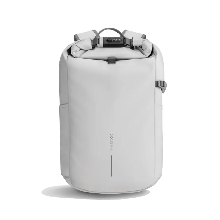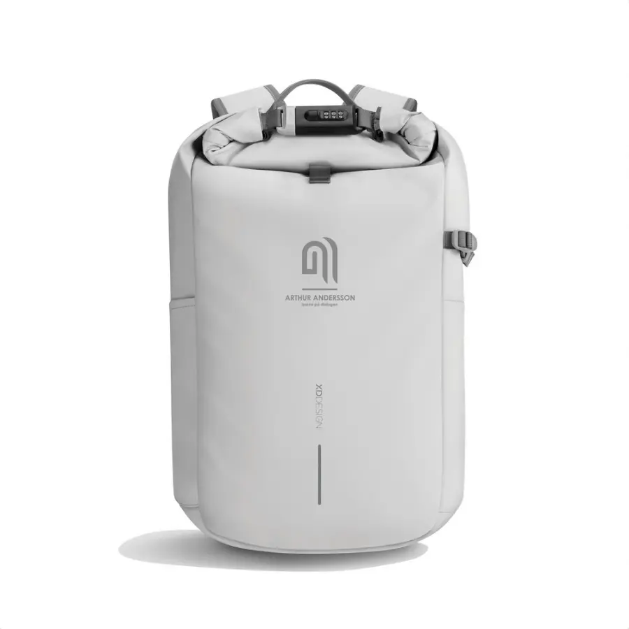 Plecak chroniący przed kieszonkowcami, zwijana przegroda główna i zamek szyfrowy wzmocniony stalą umożliwiający całkowite zamknięcie plecaka, zamek może posłużyć również do przypięcia plecaka do stałego obiektu, ukryte kieszenie do przechowywania dokumentów i kart kredytowych z tyłu torby oraz w pasku na ramię z ochroną RFID, kieszeń boczna, odpinana elastyczna siatka na sprzęt sportowy w komplecie, wewnątrz usztywnione przegrody na laptopa 16" lub tablet, siateczkowe kieszenie na inne przedmioty osobiste, całkowita zawartość materiałów z recyklingu obliczona w oparciu o wagę całkowitą przedmiotu: 11%, wzór zastrzeżony®