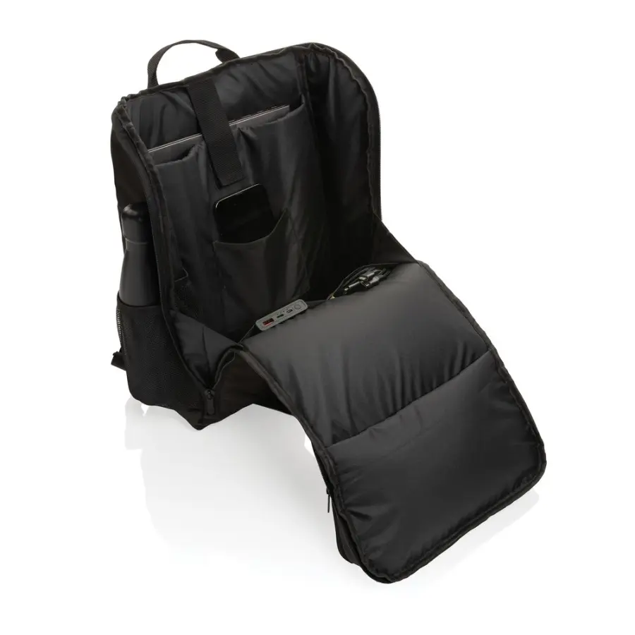 Plecak na laptopa 15.6”, ładowarka słoneczna 5W, prędkość ładowania solarnego 5V/1A, współczynnik konwersji panelu słonecznego 21%, wyjścia USB i USB typu C, wykonany z PET i ABS z recyklingu, wodoodporny IPX6 (całkowite zabezpieczenie przed strumieniem wody płynącej z różnych kierunków z wydajnością do 100 litrów na minutę), posiada znacznik AWARE™, który gwarantuje, że wykorzystane materiały pochodzą z recyklingu, 2% wpływów z każdego sprzedanego produktu z kolekcji Impact jest przekazywane na rzecz Water.org, ślad węglowy produktu: 0 kg CO2