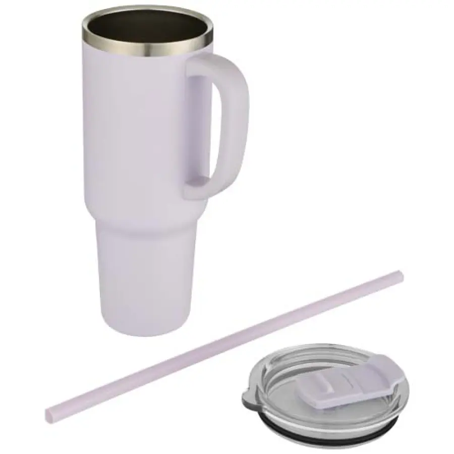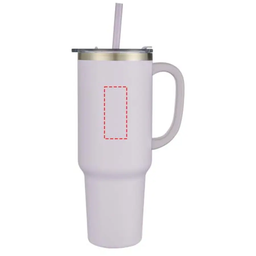 Kubek z podwójnymi ściankami z miedzianą izolacją próżniową, posiadający certyfikat RCS, wykonany w 91% ze stali nierdzewnej pochodzącej z recyklingu, która utrzymuje niską temperaturę napojów przez co najmniej 24 godziny. Posiada słomkę Tritan i funkcję przesuwania pokrywki zapobiegającą rozlaniu płynu. Wykonana w 100% z tworzyw sztucznych pochodzących z recyklingu obrotowa pokrywka bezpiecznie utrzymuje słomkę na miejscu i można ją łatwo obrócić, aby odsłonić otwór na napój. Trwała zewnętrzna powłoka proszkowa. Pojemność: 1200 ml. Tylko do mycia ręcznego.