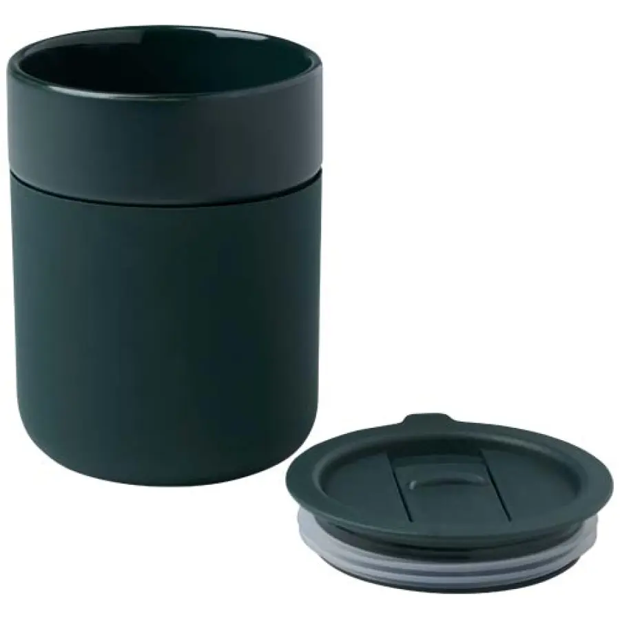 Java jednościenny kubek ceramiczny o prostej i praktycznej konstrukcji do codziennego użytku, jest wyposażony w silikonową osłonę zapewniającą wygodny chwyt. Wieczko zapobiegające rozlaniu płynu. Pojemność: 330 ml.
